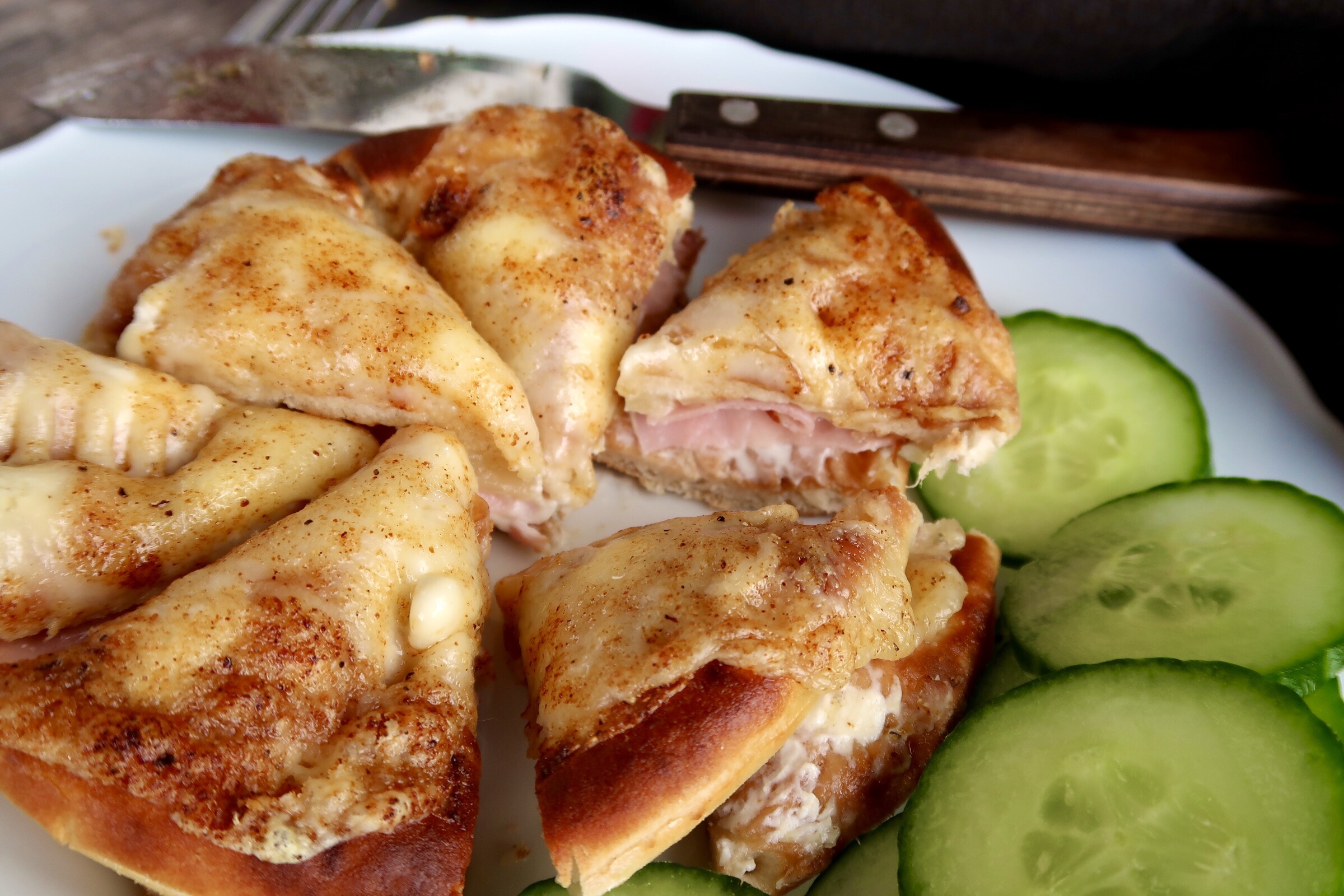 2) Bred röran på 2 av skivorna, ha på 2 skivor skinka och 2 skivor ost på varje.