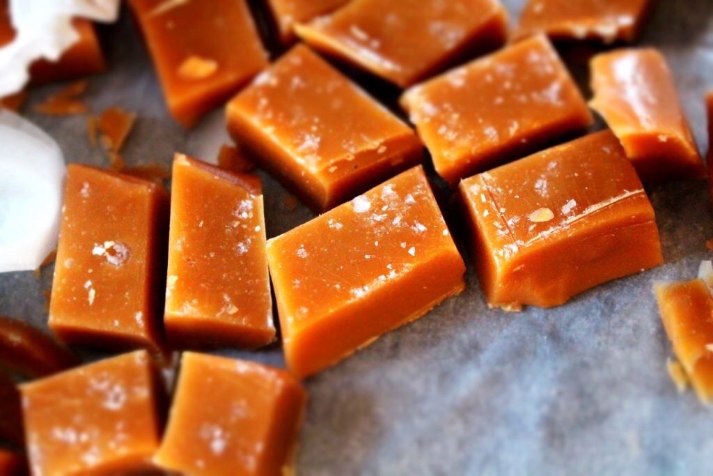 3) Tillsätt vaniljsockret mot slutet. Häll i smeten i en form med bakplåtspapper. Strö över flingsalt. Låt stelna. Skär upp i bitar och slå gärna in i bakplåtspapper.