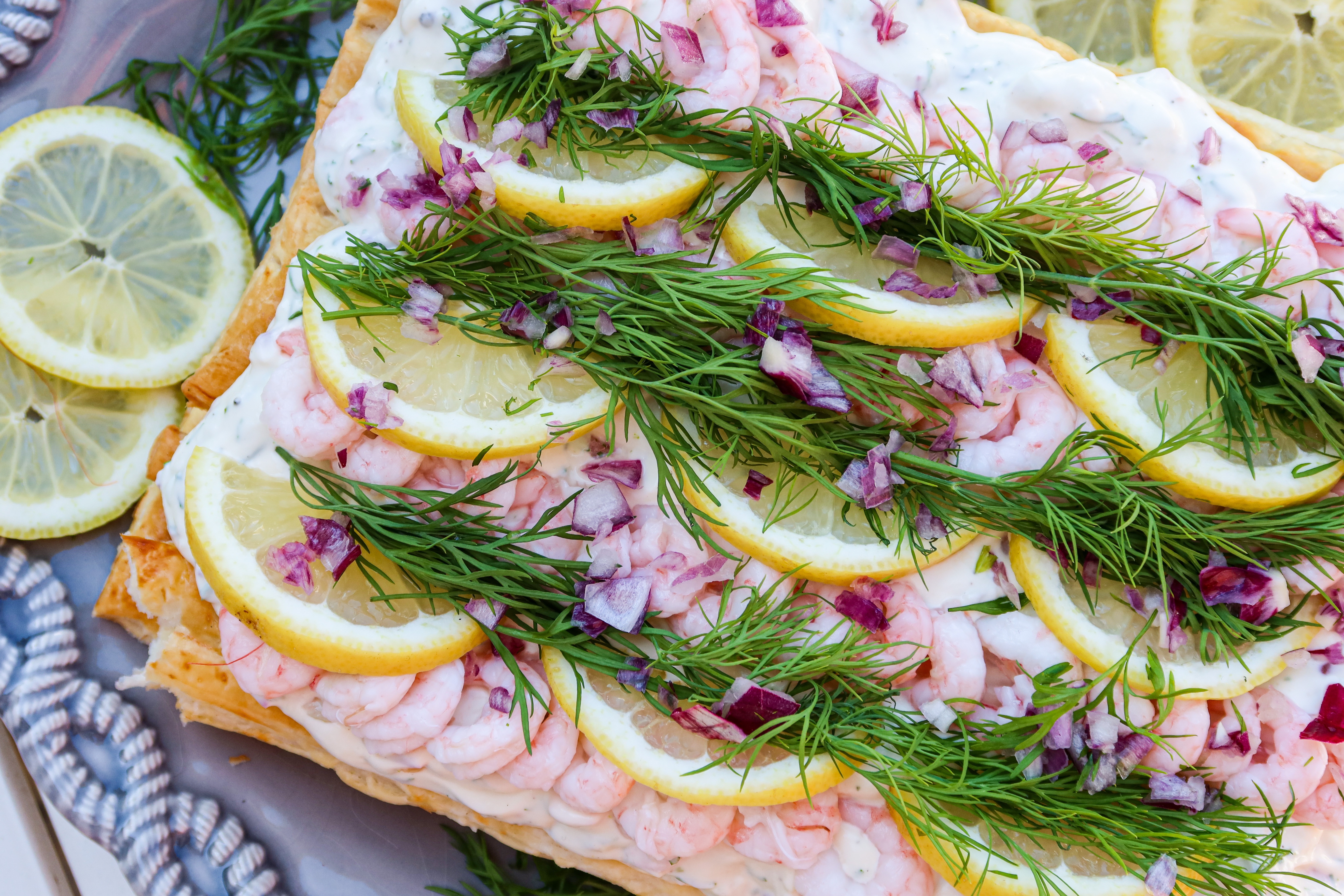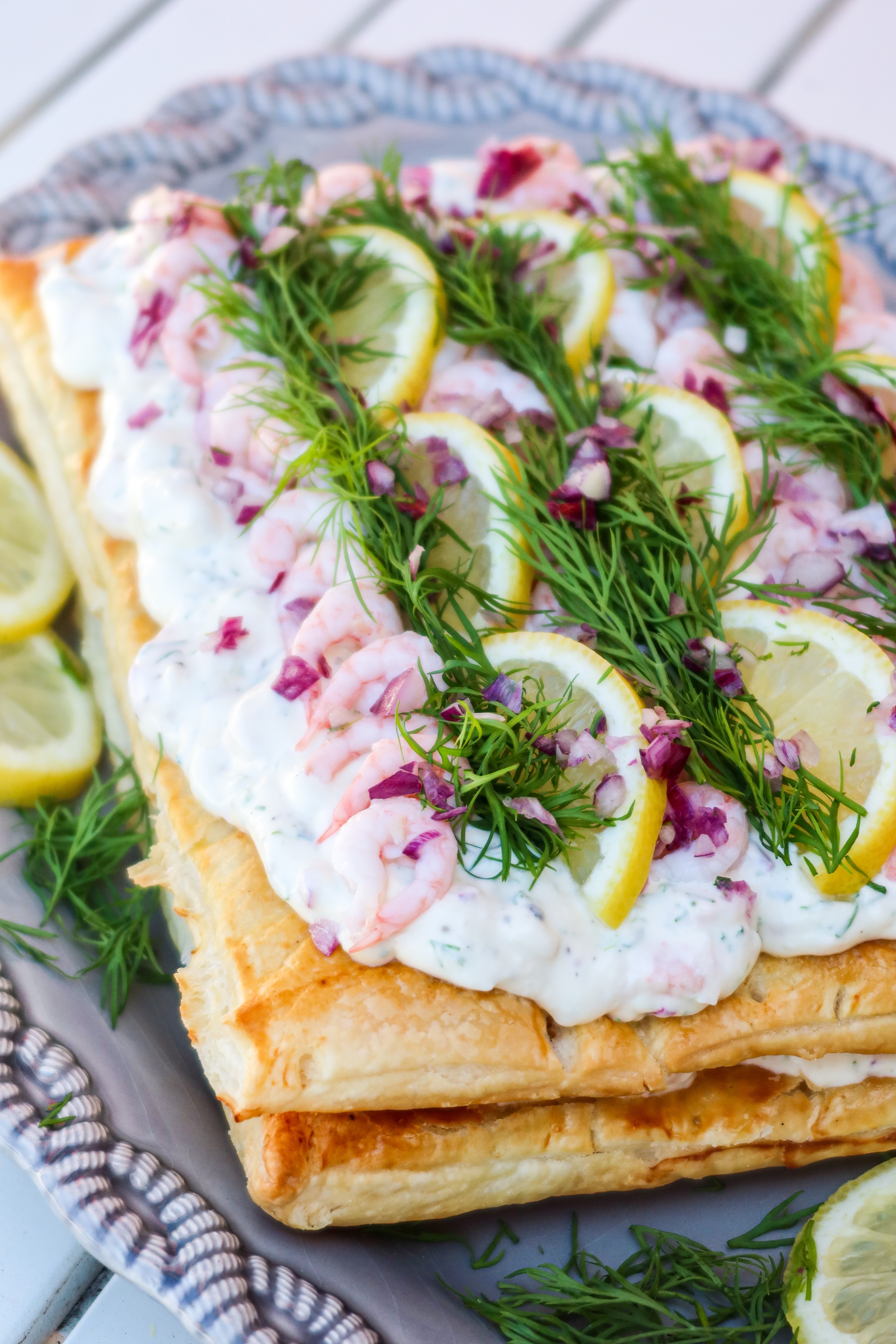 3) På första smördegsrektangeln, bred ut hälften av räkröran. Lägg på den andra rektangeln, bred sedan ut resten på översta smördegsrektangeln. Dekorera.