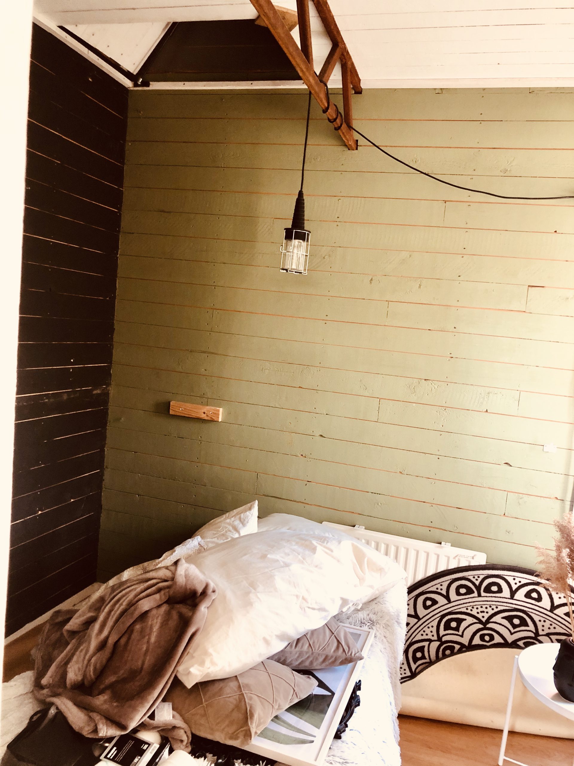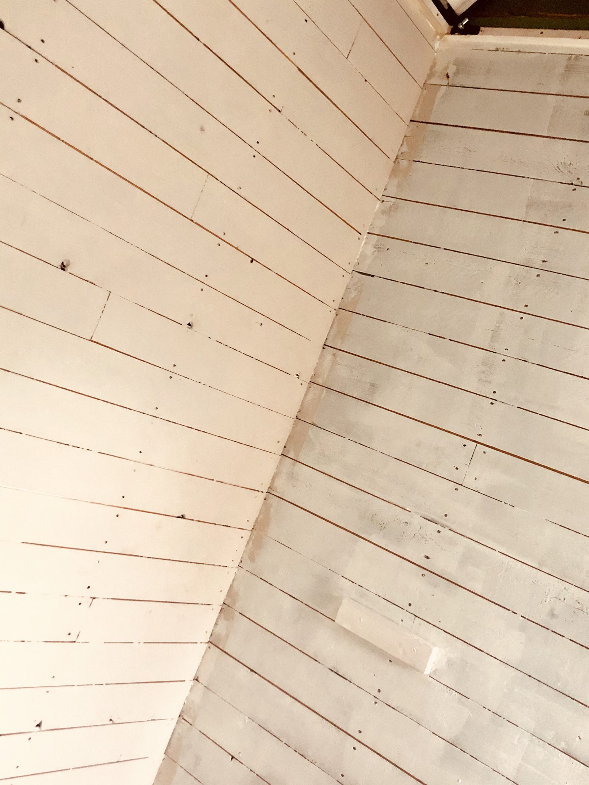 Här en liten sneakpeek på ett hörn i rummet. En grundmålad vägg och en vägg som är struken med riktiga färgen 1 gång. Gillar mellanrummen i panelen…. ger en lite ruff känsla, precis så som jag gillar.