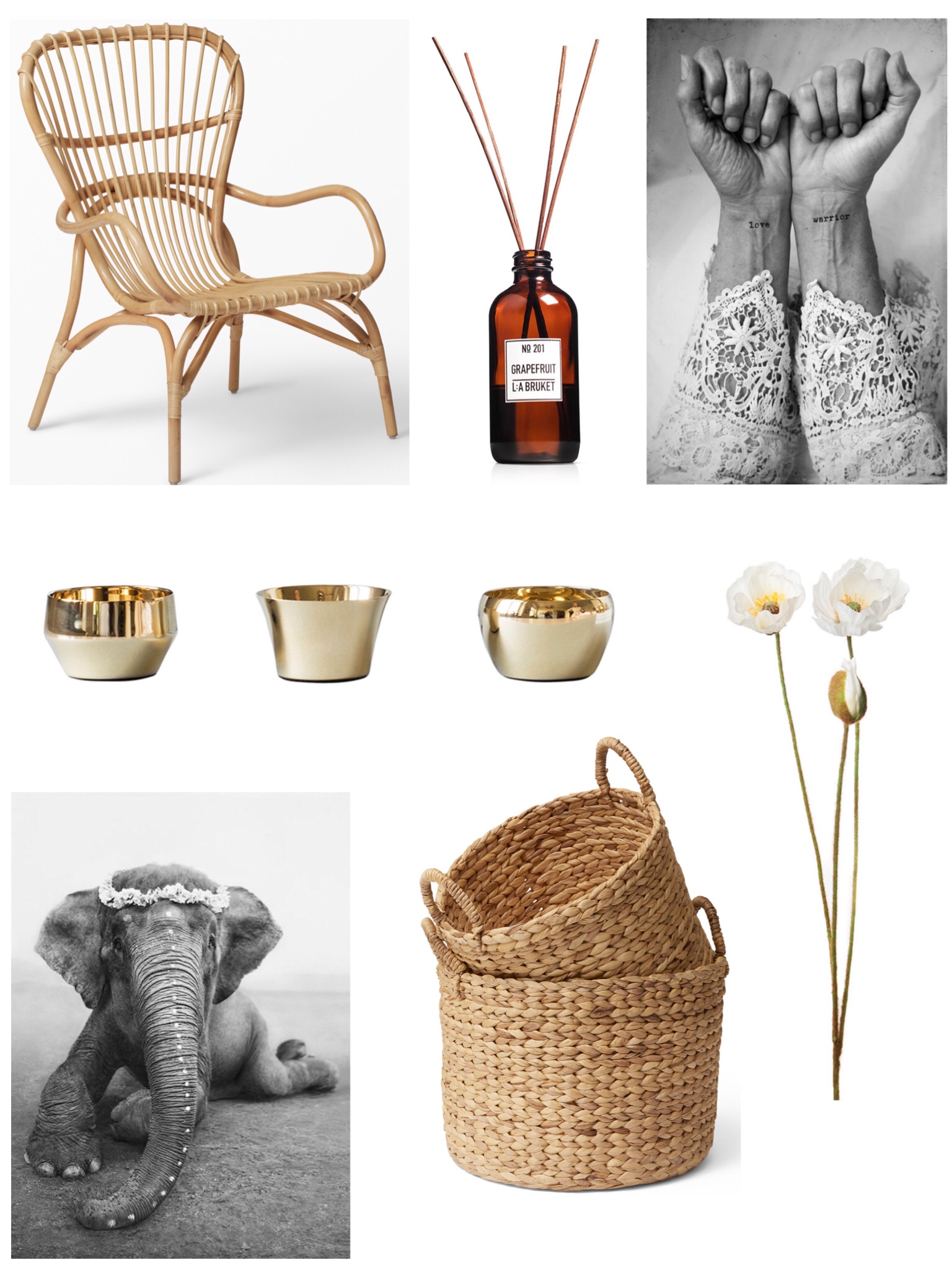 Rumsdoft // Elefant poster // Love Warrior poster // Skultuna ljushållare // Vallmo växt // Rottingfåtölj // Korgar
