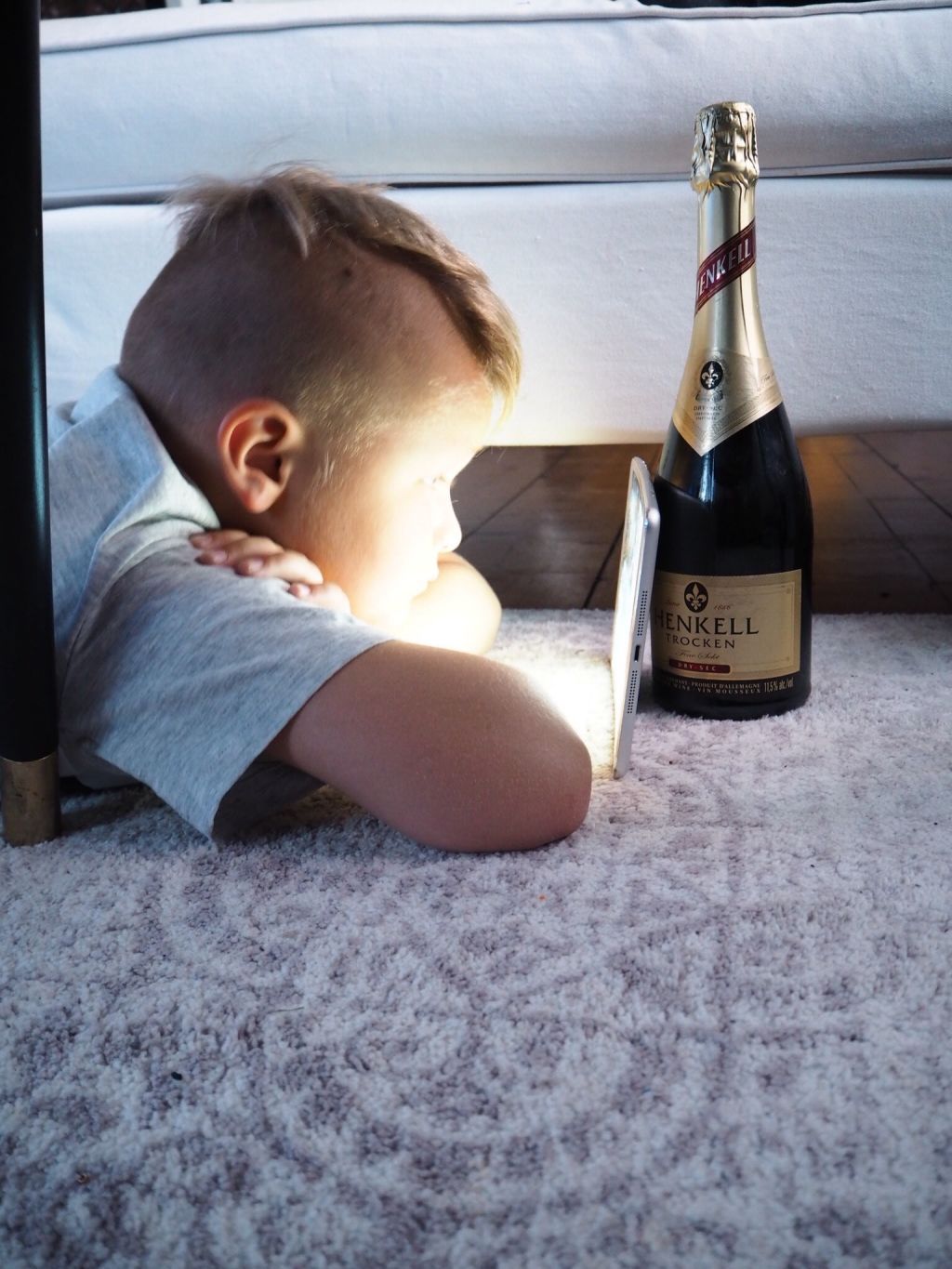 Här har mamman plockat föräldrapoäng. Man är lite skön och fixar ett schysst iPadstöd av en gammal Henkell Trocken bubbel. Ja herreminjee alltså….