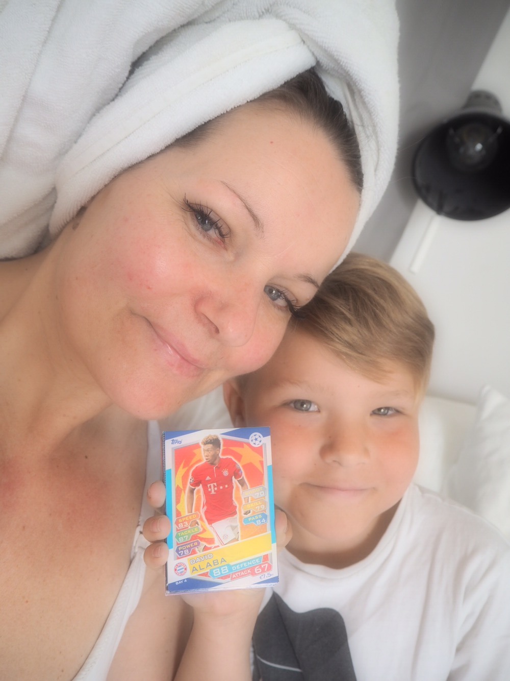 Nyduschad mamma och den här fisen hemma idag då han var lite febrig igår. Vi fick varva med att vara i Kaffestugan igår. Det gick det också även om det var lite körigt. Här visar han dig……. tadaaaaaa, fotbollskort. What else liksom? Här är det fotbollskort för hela slanten. Tony har ju en sån fotbollskortspärm från när han var liten som Tonys mamma sparat. Han ÄLSKAR att titta i den och kallar alla för legender.