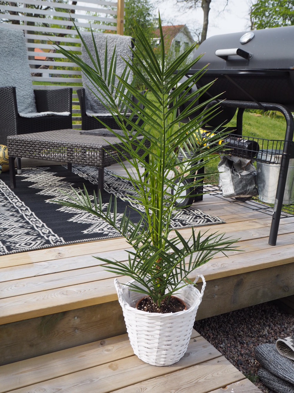 Åh, en liten palm! I sommar när man sitter på den här altanen och dricker en öl efter en varm sommardag alltså….å så vinden i palmen. ÄLSK! ❤️ Mattan (<länk) i bakgrunden är av plast, jag har två såna på altanen. Det blir en helt annan ombonad känsla med mattor på uteplatsen. Faktiskt lite mer medelhav också.