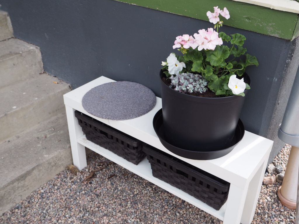 Precis vid trappan har jag ställt en ljugarbänk. Här sitter jag och dricker kaffe ibland. Så mysigt och filosofera om livet och zippa på en kaffe. Här satt jag i lite nya blommor igår i den här stora svarta plastkrukan. Riktigt mysigt!
