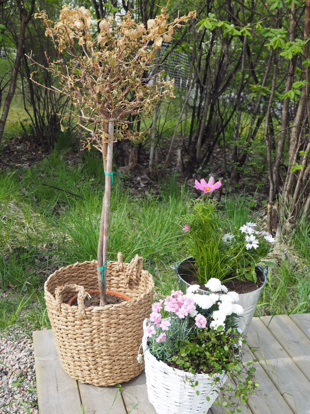 Vi har en ful död stubbe utanför vårt uterum, den blev ju genast mycket finare med lite blommor.