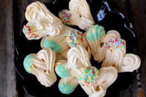 Enkelt att spritsa ut på bakplåt, grädda…sen doppas ena hörnet i vit choklad och så strösslas det lite strössel uppepå.