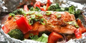 4) Placera foliepaketen i en ugnsform och tillaga i ca 20 minuter i ugnen. Alternativt så tillagar du laxpaketen på grillen i ungefär lika lång tid. Öppna foliepaketen försiktigt när du tatt ut dem ut ugnen. Garnera med grön lök och servera med ris eller kokt potatis.