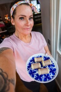 Marsipanens dag och jag tänker att jag ska bjuda på ett riktigt härligt gammalt recept som tål att upprepas. Marsipan som är såååå gott, fråga min tonåring här hemma så skriker han jaaaaaa. Marsipanens dag behöver ju inte firas över huvudtaget om man inte vill. Men vill du det så kan du fira det med att svänga ihop dessa snabba Punschrullar. Alltså dessa punschrullar fuskade jag ihop. Busenkla att göra, och det tog på pricken mindre än 5 minuter och blev såååå goda! Man behöver inte göra det svårt om man inte vill. Mina punchrullar till Marsipanens dag innehåller inte punch, men dom innehåller arrak och det är kanske det godaste jag vet i livet. Arraksbollar…. Mmmm, svimmar nästan när jag tänker på det. Dessa punchrullar blev olika stora och inte alls så snygga, men vet du, faaaaarligt goda! Jag valde att göra dem rosa idag, originalet är ju med grön marsipan och mörk choklad i ändarna. Det där gör du som du vill. Detta är en snabbvariant, i vanliga fall ställer man smeten i kylen i 30 min men jag hoppade över det, förvara dem i kylen när de är klara kan du däremot göra. Vet ni förresten varför de kallas även dammsugare? Jo, två saker. Det ena är att den påminner om 20 talets dammsugare. Det andra är att det sägs att konditorerna ska ha gjort punchrullar av golvets smulor och dränkt det i punch så man inte känner mögelsmaken. Huuuu…. Jaja, dessa är inte gjorda på några smulor från golvet i alla fall. 😅