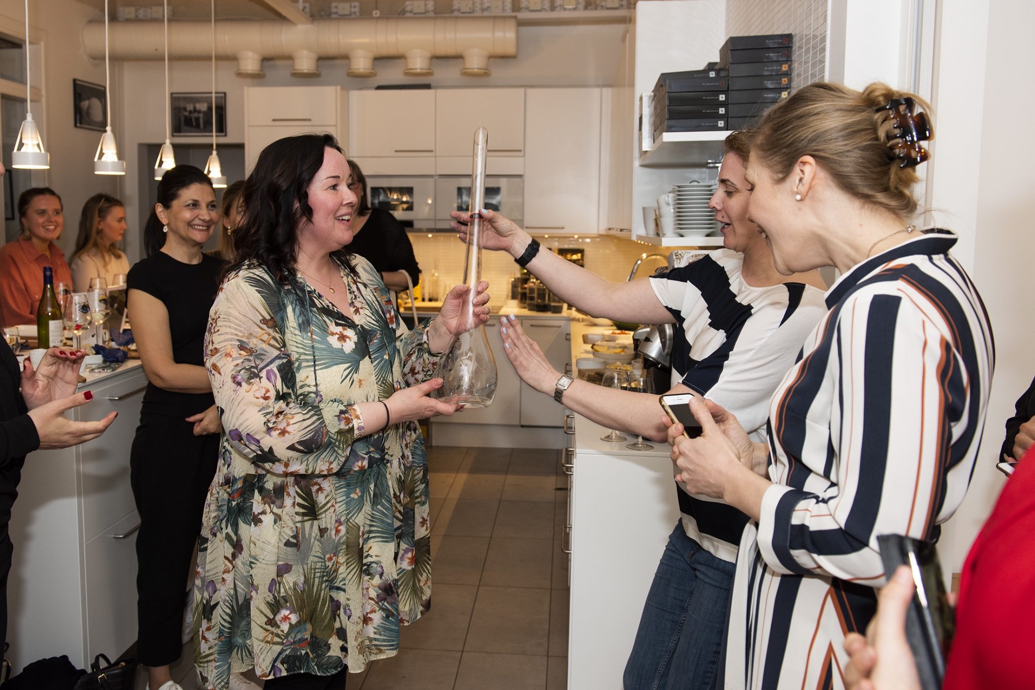 Härliga Linn som är VD och ägare hällde upp vinet i denna maffiga vinkaraff. Den var också första priset i kvällens tävling som gick ut på att göra det godaste tilltugget till vinet.