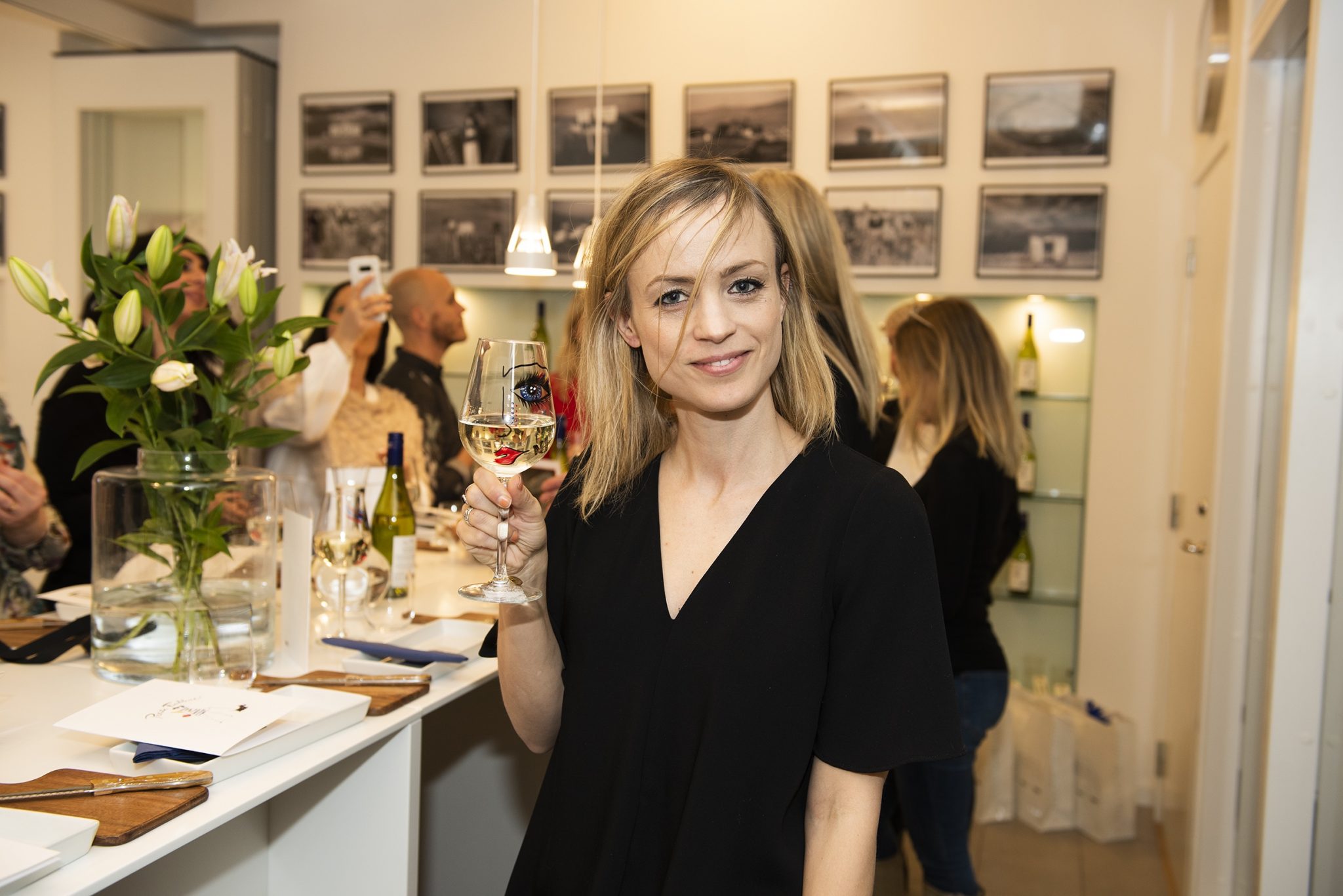 Härliga Linn som är VD och ägare hällde upp vinet i denna maffiga vinkaraff. Den var också första priset i kvällens tävling som gick ut på att göra det godaste tilltugget till vinet.