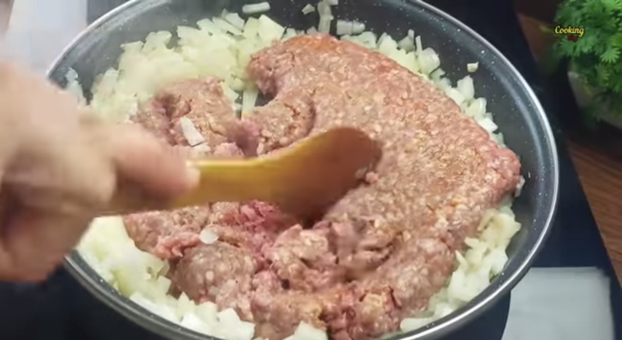 3) Under tiden fixar du fyllningen. Hacka löken, pressa vitlöksklyftorna och stek detta i en stekpanna. Ha också i köttfärsen och bryn den ordentligt. Krydda med alla kryddor och ha i tomatpure, ketchup och kalvfond.