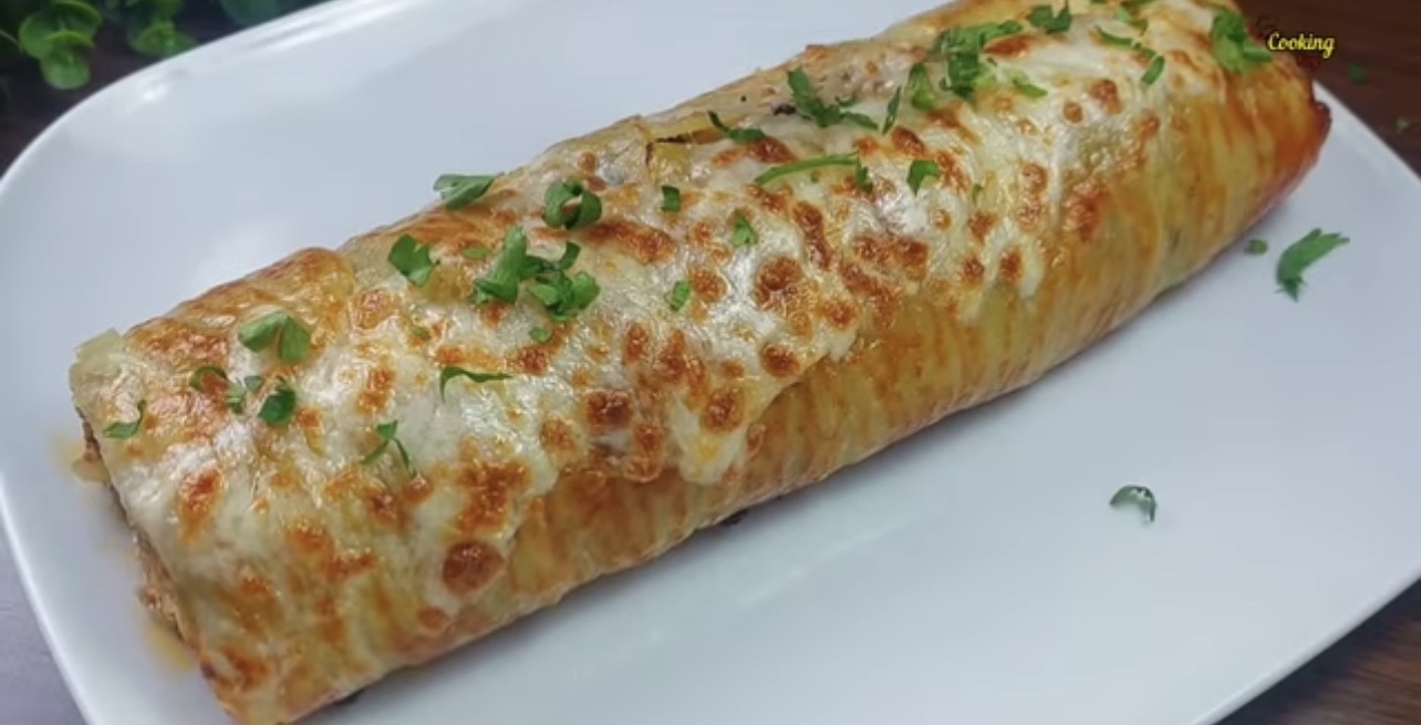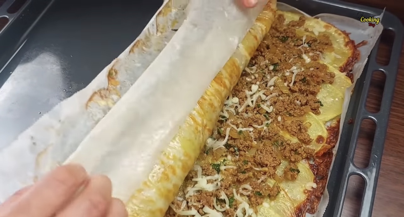 4) Ta ut potatisen och fördela ut köttfärsröran över. Toppa med den rivna osten. Rulla sedan ihop detta till en rulle.