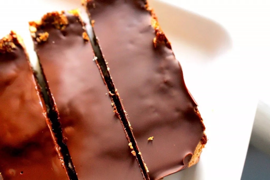 7) När den sedan svalnat av och stelnat i choklad tar en vass kniv och dela upp till 8 bars.