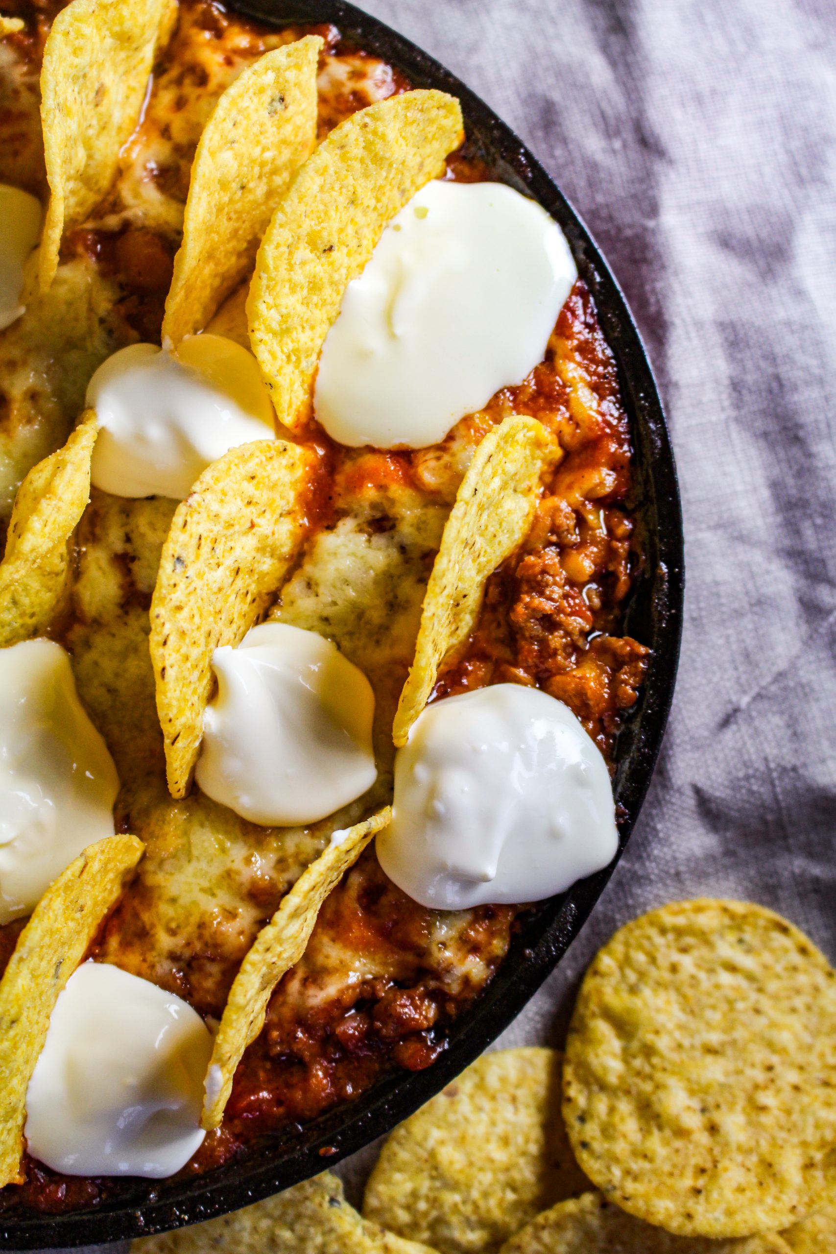 nachoschips, riven ost och creme fraiche till topping