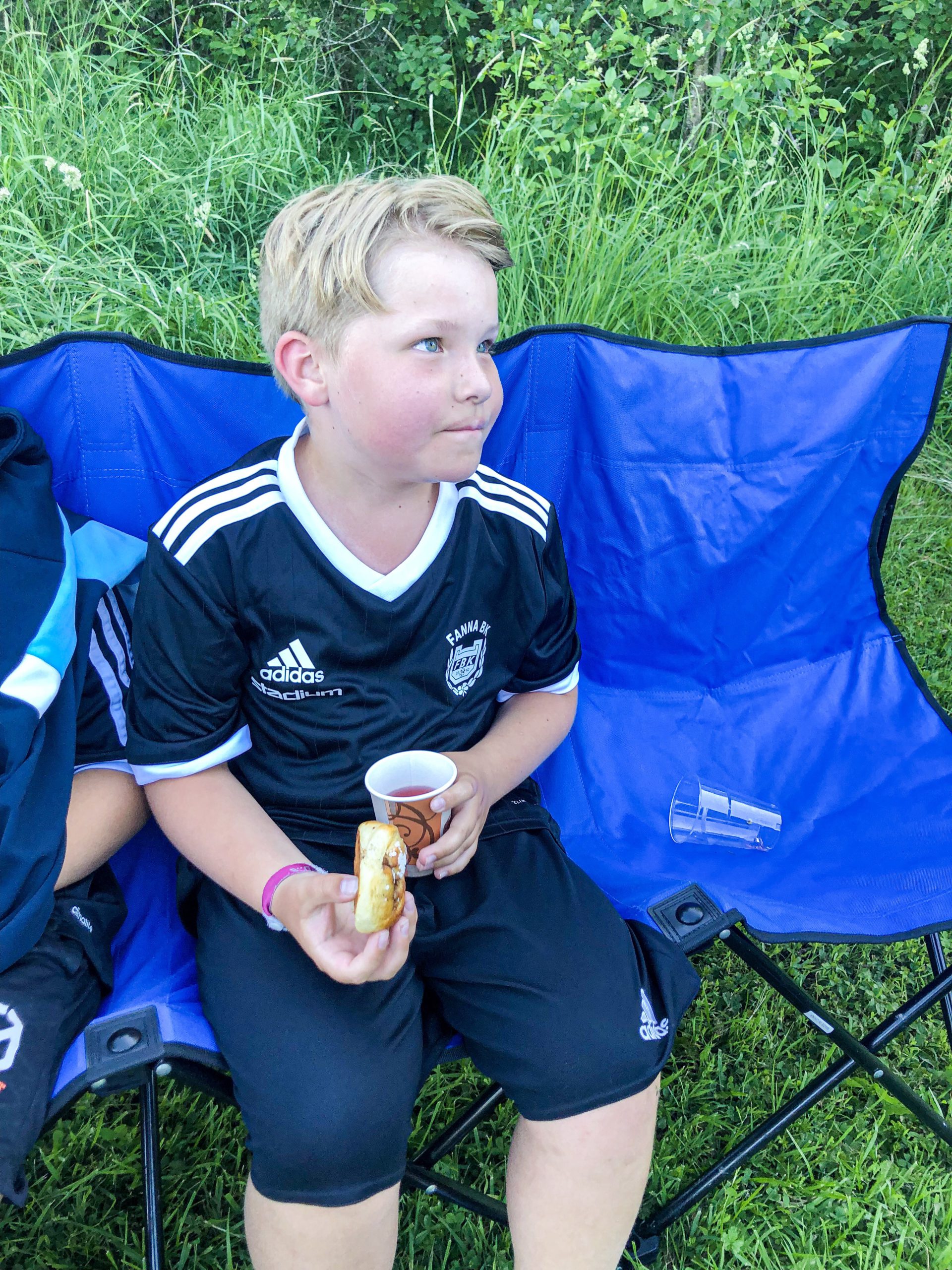 Efter loppet bjöds det på saft och bulle, här med lag och klasskompisen Hugo bredvid.