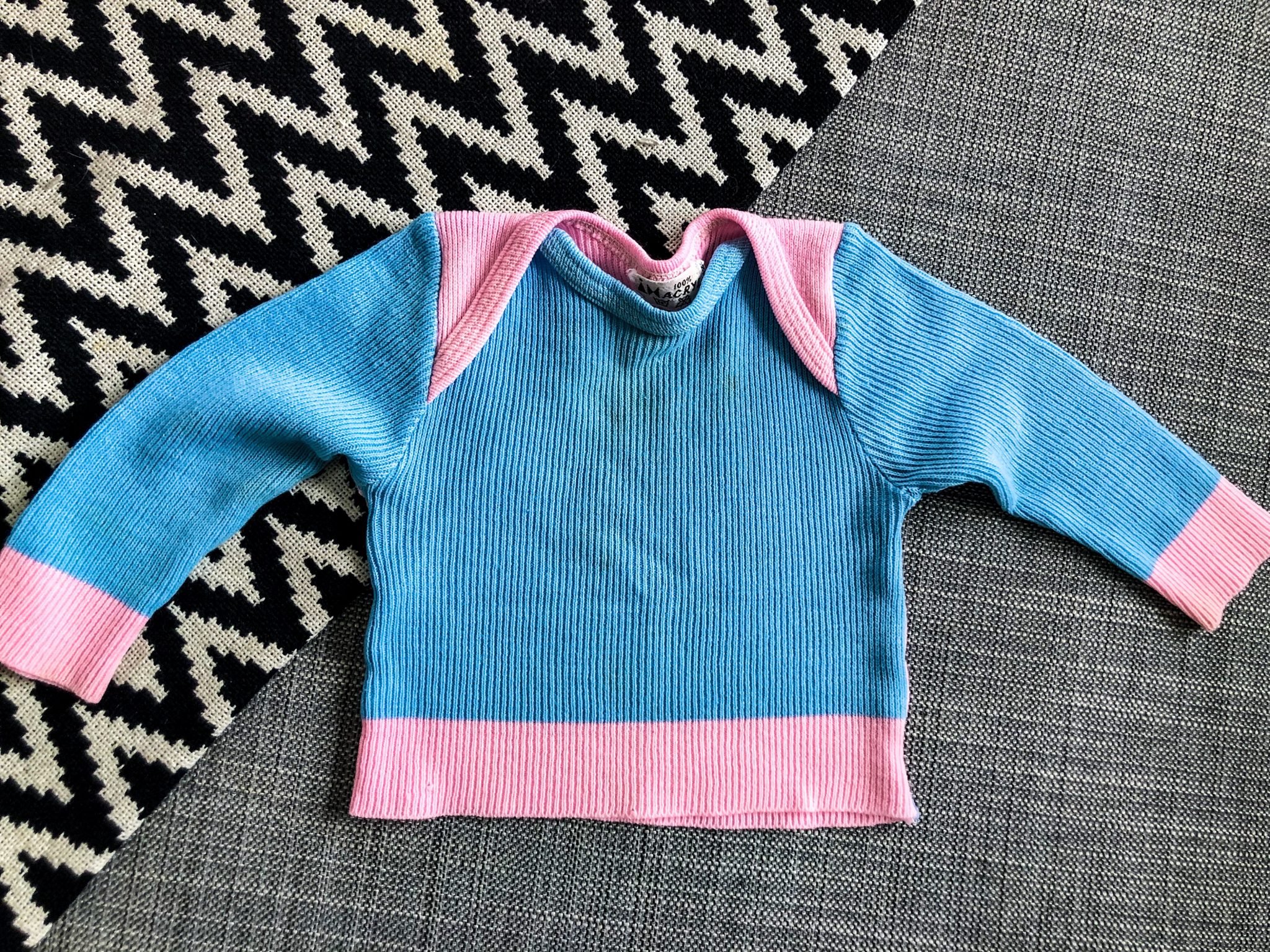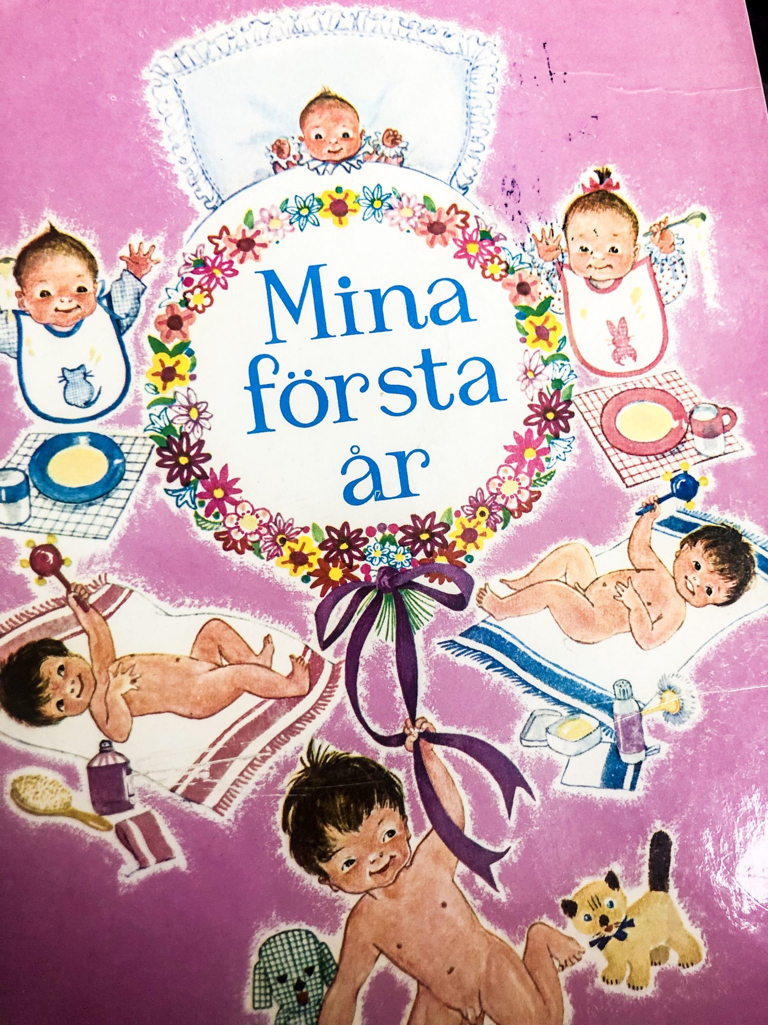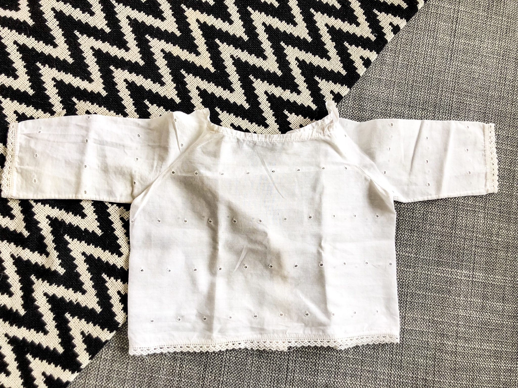 Klänningen högst upp har mamma virkat. Den hade jag på min andra fotografering i livet. Det var då mamma brände mig med locktången på örat och jag tjöt mig igenom hela fotograferingen. När vi kom hem hade jag en blåsa stor som en enkrona på örat. ”And the molnig the year award….” hahaha! Hittar inte bilderna på mig i klänningen nu bara, hade varit roligt att visa dig. En gammal tröja med fläckar kvar som inte går bort, den underbara lilla sparkdräkten och lilla vita som jag hade under min dopklänning. ❤️