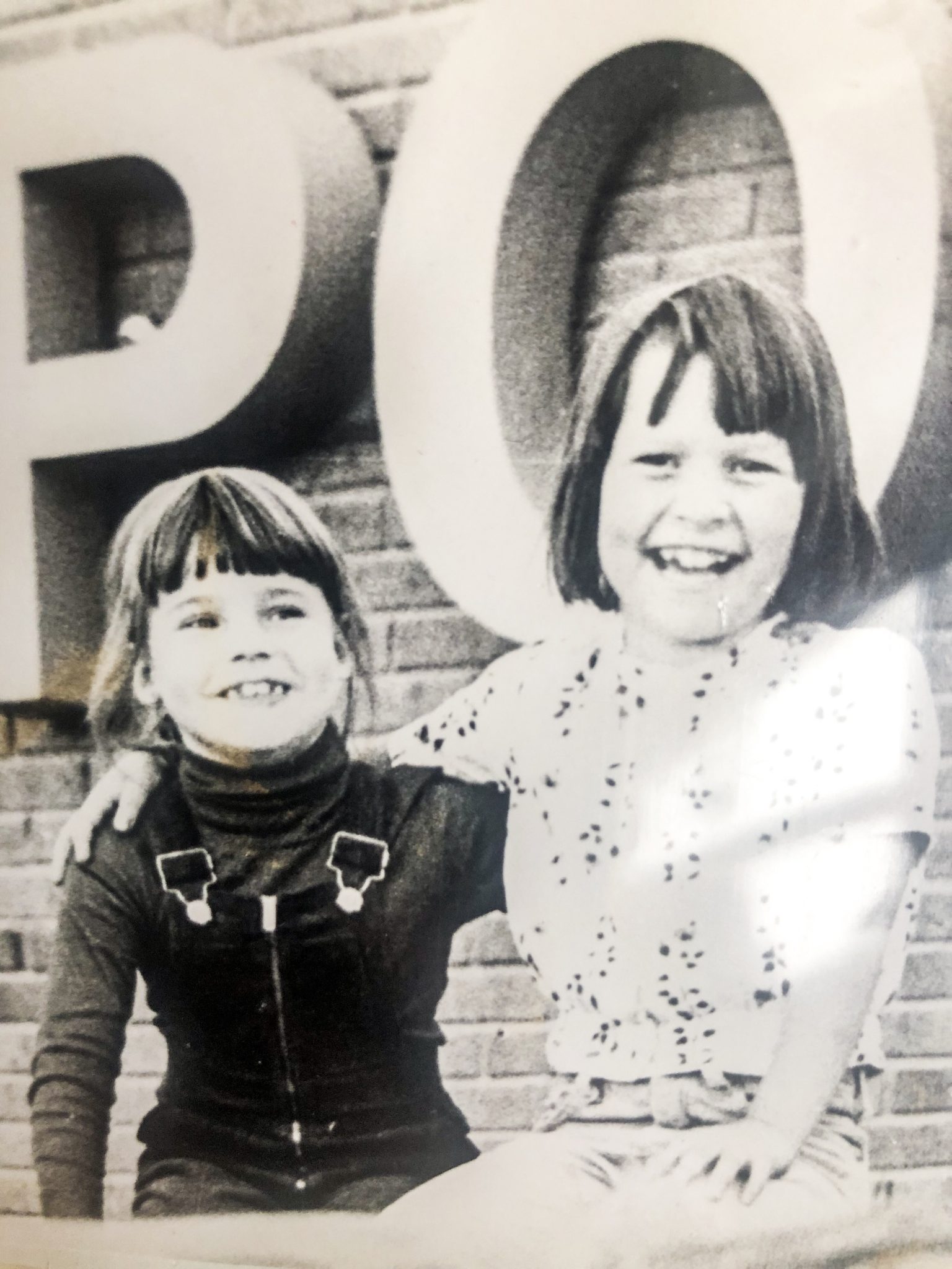 Jag och min dåvarande bästa kompis Lisso utanför bowlinghallen där våra föräldrar alltid tränade och spelade. Ser ni att vi är svinbusiga och springer utan skor ute?