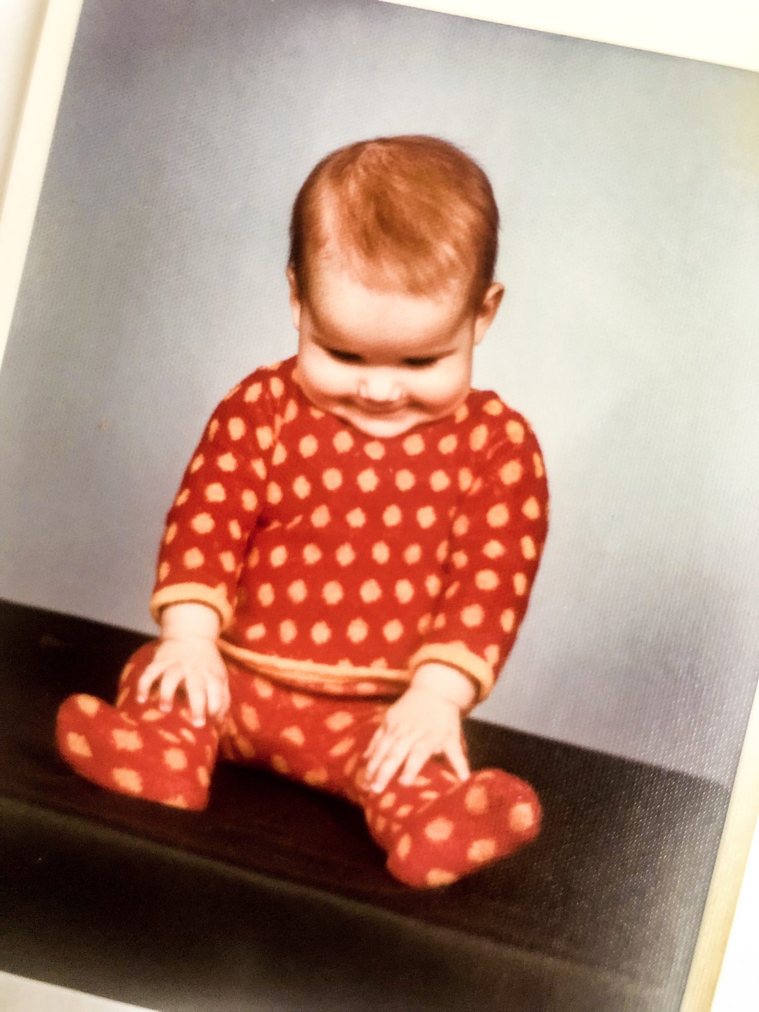 En liten Nina. Jag var finurlig redan då berättade mamma och pappa. Syns på ögonen på något sätt.