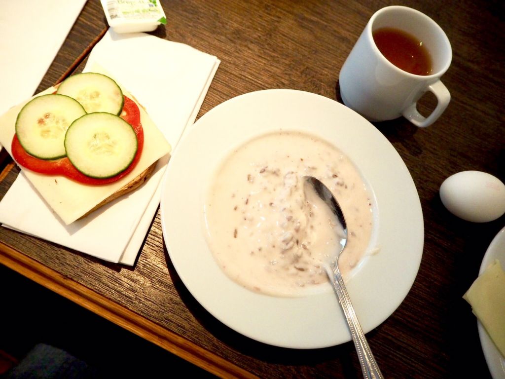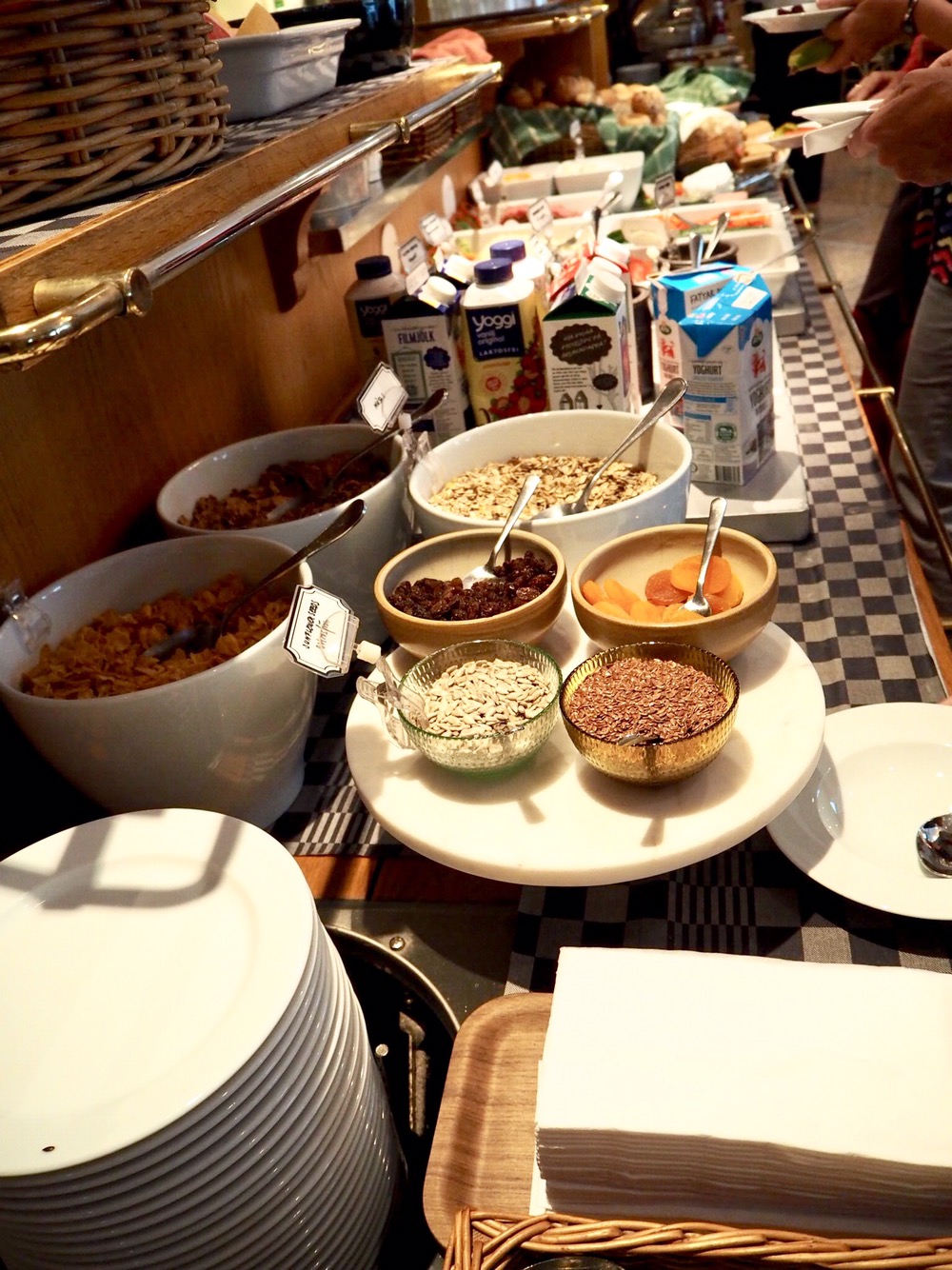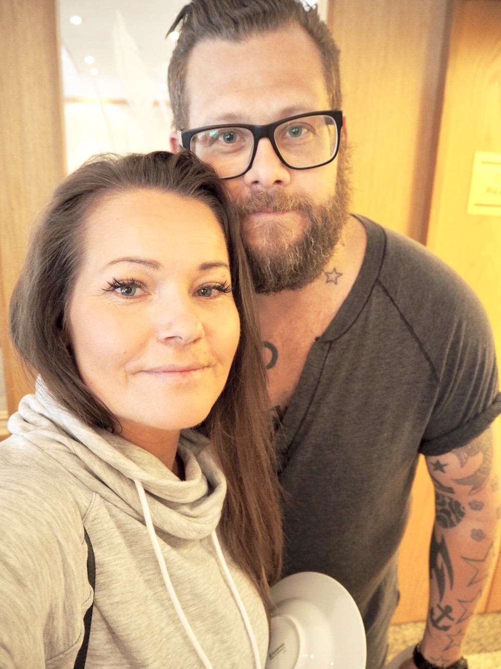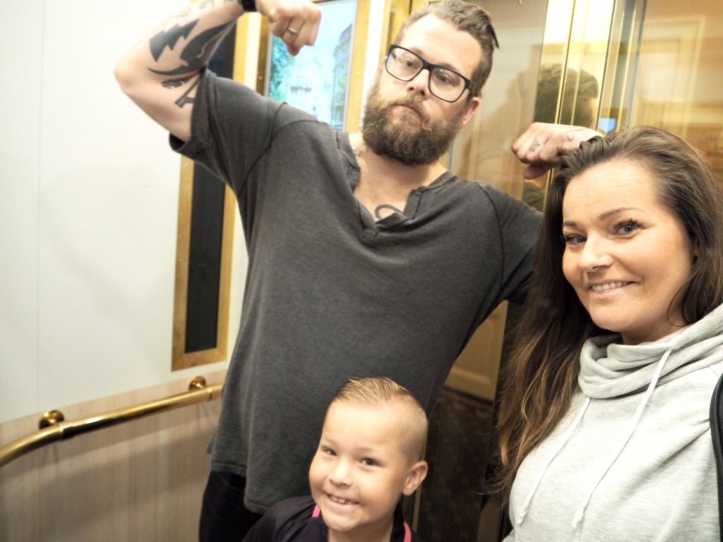 Starka familjen på väg till frukosten. Jag livrädd i hissen som vanligt.