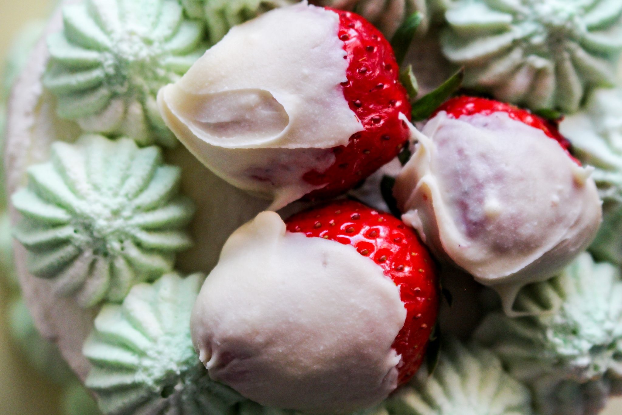 3) Smält den vita chokladen i mikron (tänk på att det ska vara av god kvalitet, annars smälter den inte ordentligt) och doppa jordgubbarna i den smälta chokladen. Vispa grädden.