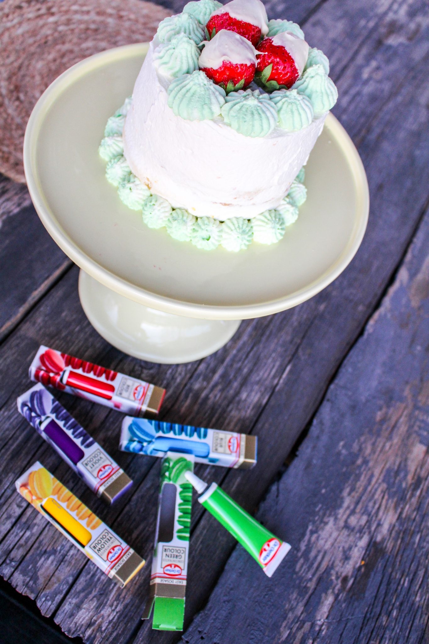 4) Montera. Dela botten i 3 delar, montera och fyll varje del med jordgubbsfyllningen. Täck sedan tårtan med grädde, spar en del av grädden och blanda i lite färg (valfritt) och spritsa uppepå tårtan. Lägg jordgubbarna uppepå tårtan.