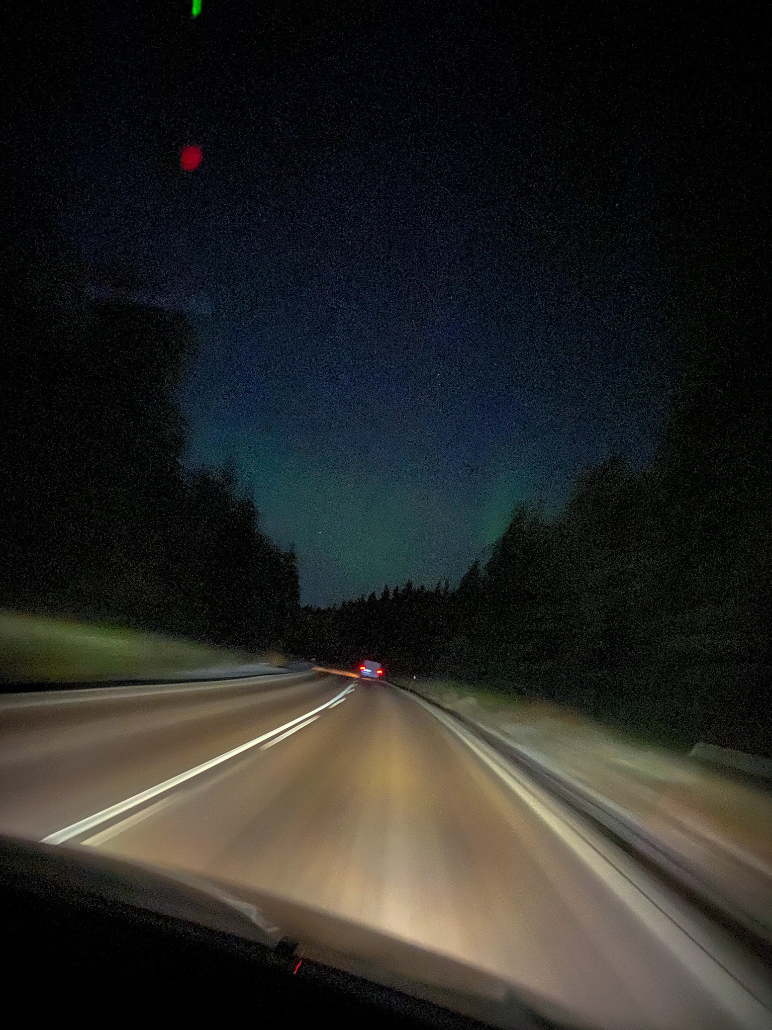 Plötsligt skriver Mia en tjej jag känner att dom sett nere vid sig, vi bor inte långt ifrån. Tony och jag klädde på oss och gav oss ut. Långt bort, svagt svagt kunde jag se att det skiftade grönt. Men det var för ljust. Vi kastade oss i bilen och gav oss iväg. Där på en mörk väg så sken det plötsligt upp, fick tips om att titta på det genom kameralinsen på telefonen. Jag skrek rakt ut när jag kunde ana det.
