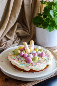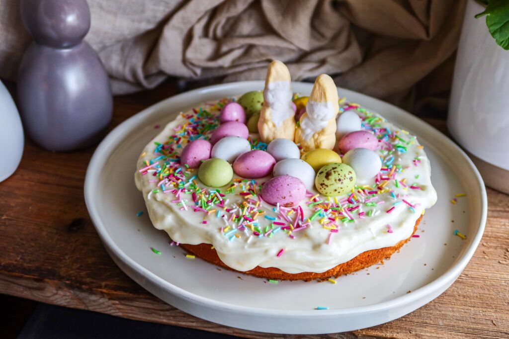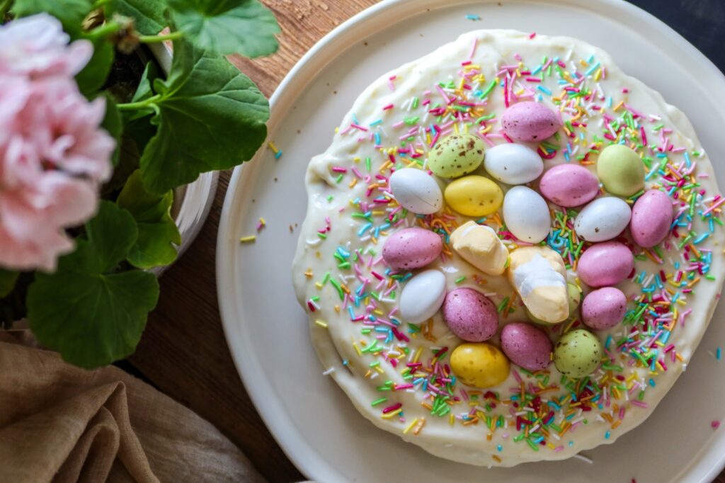 Bred frostingen över den svala kakan och dekorera med påskgodis – gör det gärna lite lekfullt med färgglada chokladägg och strössel!