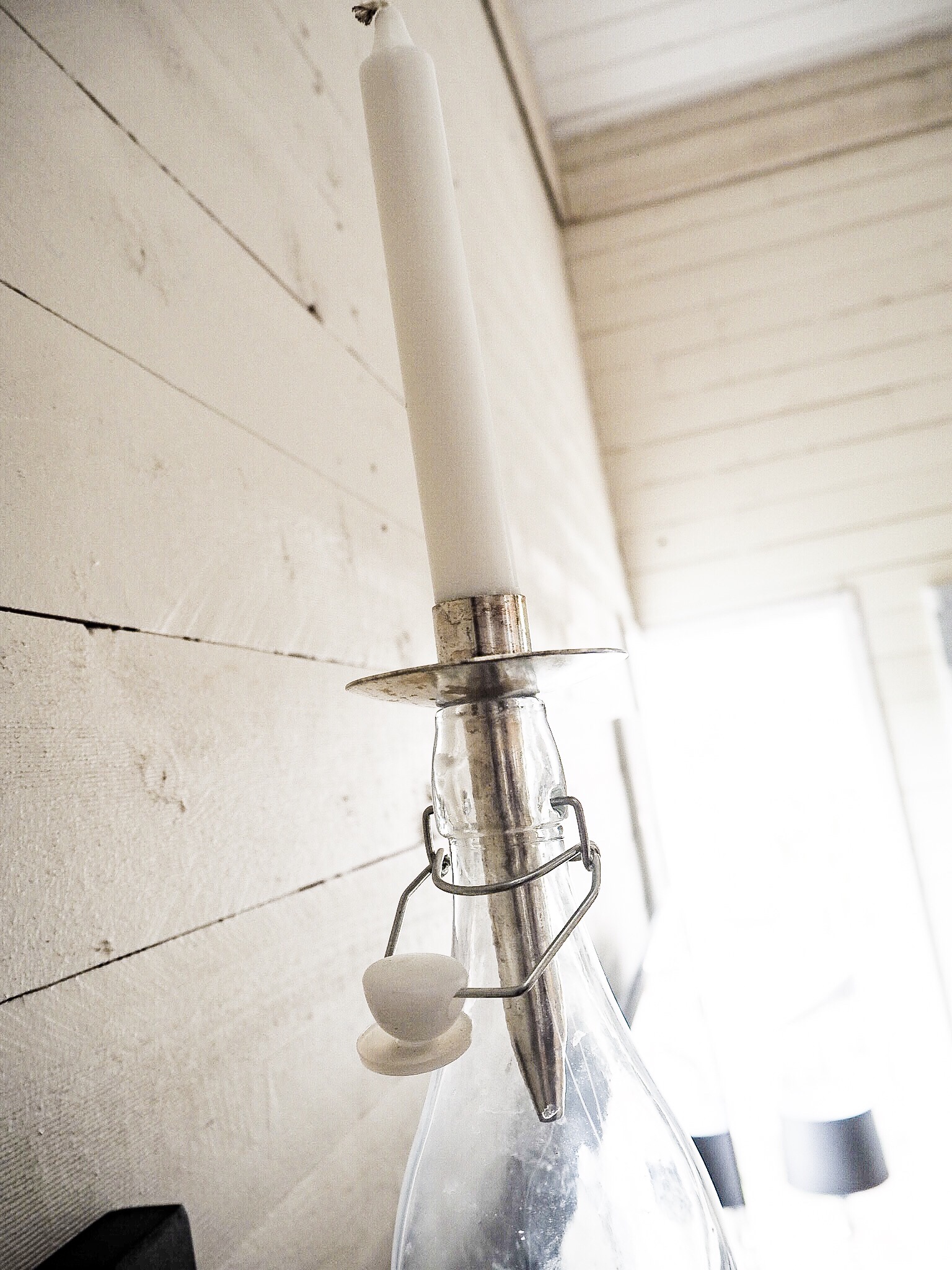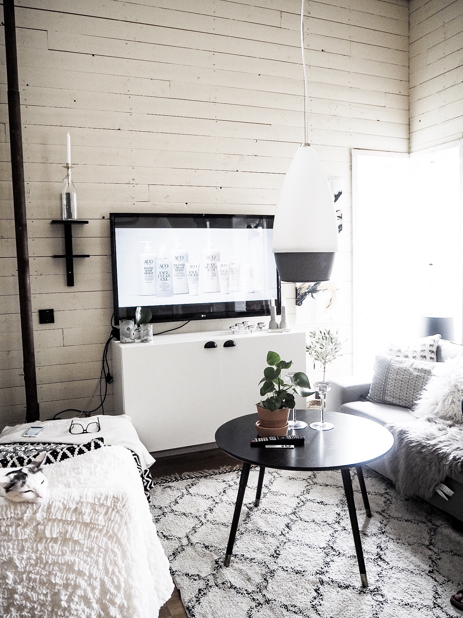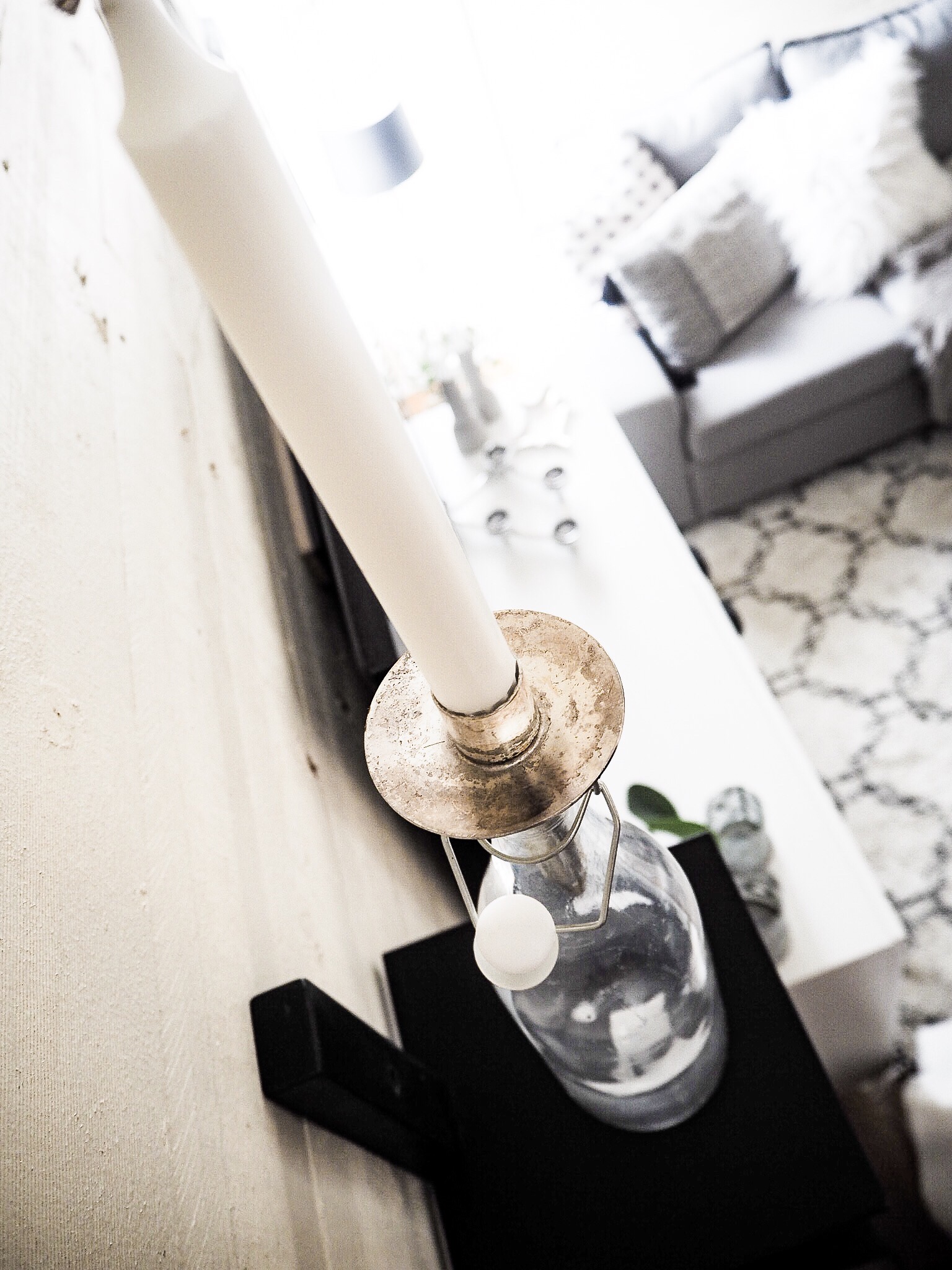 Satte upp en hylla bredvid TV:n, än så länge har jag fått upp en flaska med ljus i på den. Jag älskar ju den där lite ruffa stilen. Lite trädetaljer, svart och vitt.