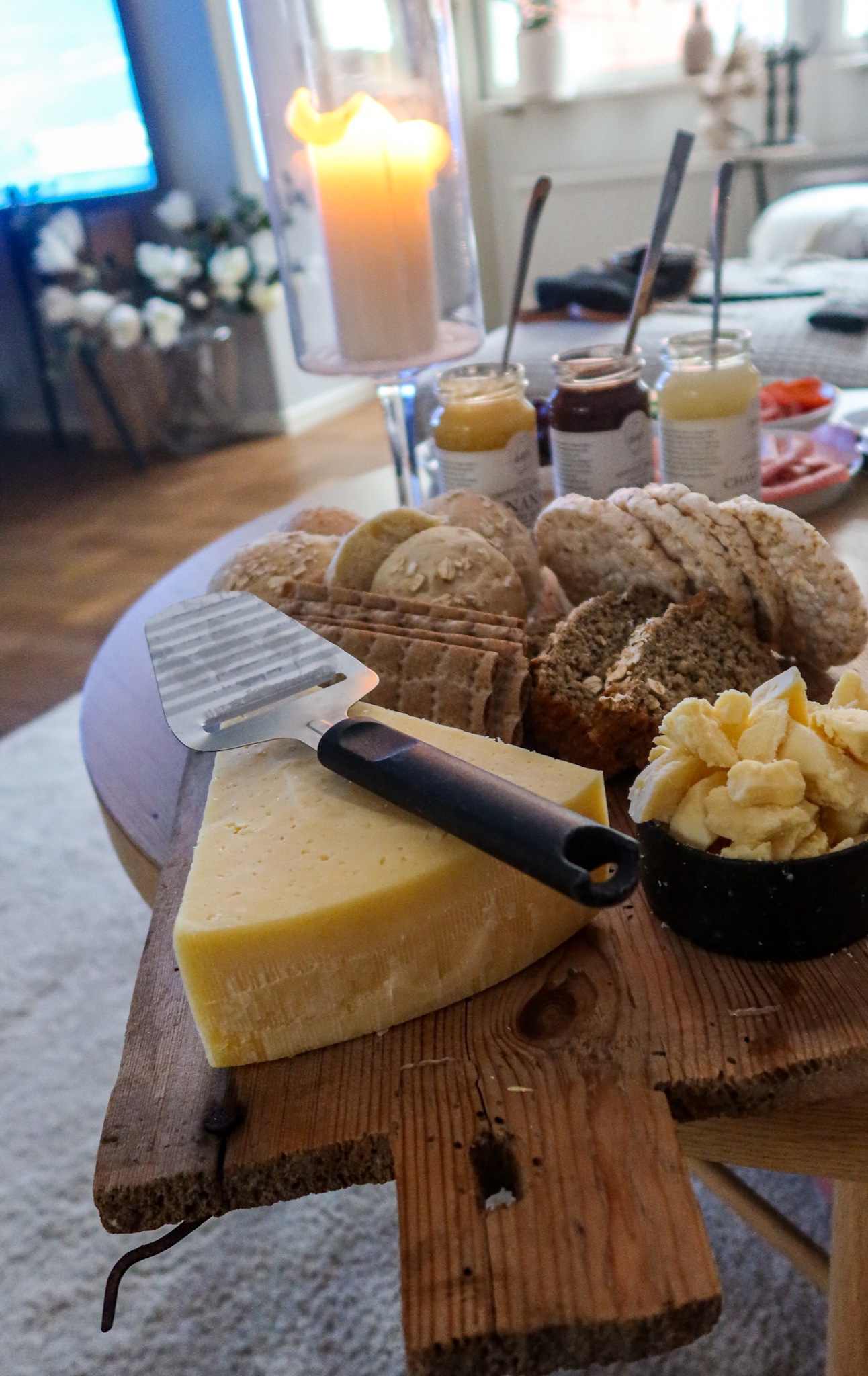 Skar upp lite av min favoritost Black Bomber. Den är liksom fin att serveras ut sin egen bytta. Jag brukar bara skära loss locket så att säga, sedan skär jag med en kniv i osten hejvilt och så ställer jag fram den så. Blir perfekta krämiga bitar som man kan äta. I söndags åt jag med en klick marmelad på varje, omöjligt att sluta äta.