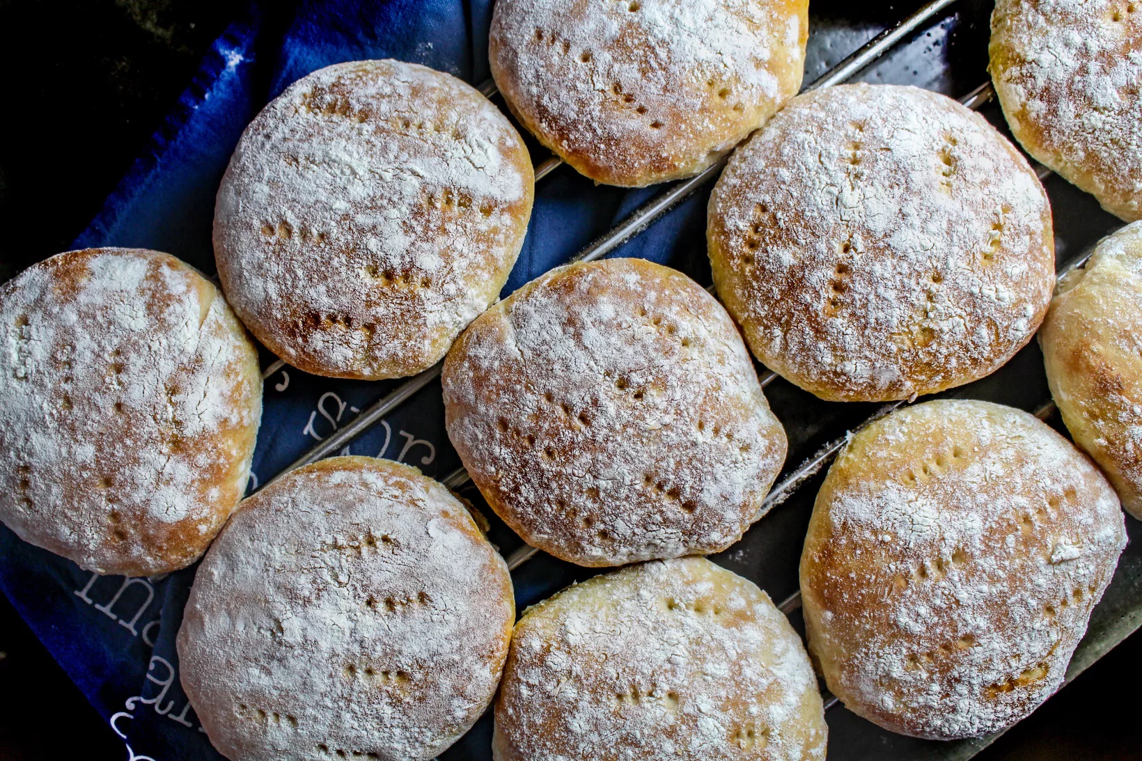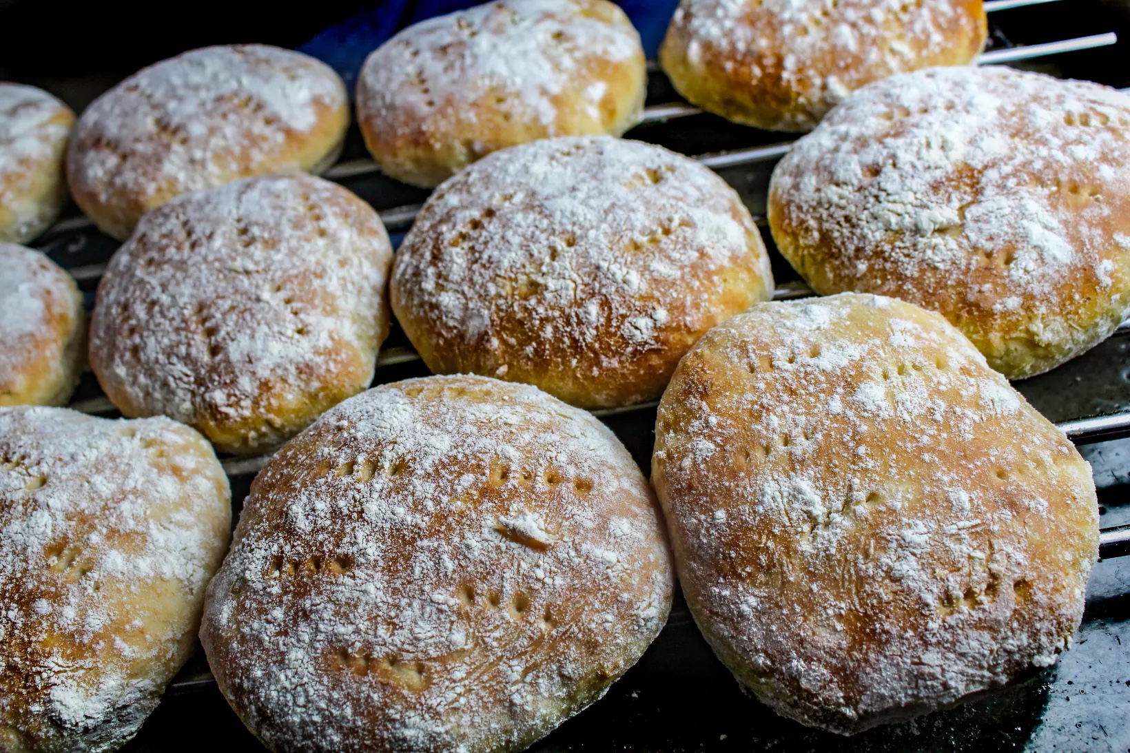4) Häll ut rejält med mjöl på bakbordet och häll ut degen på mjölet. Knåda runt den lite. Ta sedan ur 30 bitar ut degen och forma tekakor och lägg dessa på bakplåtpappersklädd plåt. Ha mjöl på händerna så är det lätt att jobba med degen.