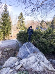 Dagen började himla mysigt alltså. Milo och jag gick ut på äventyr. Vi har kollat träd, djur, åkrar, isar och andra spännande saker i skogen. Länge höll vi span på ett djur som låg och kura under en gran.