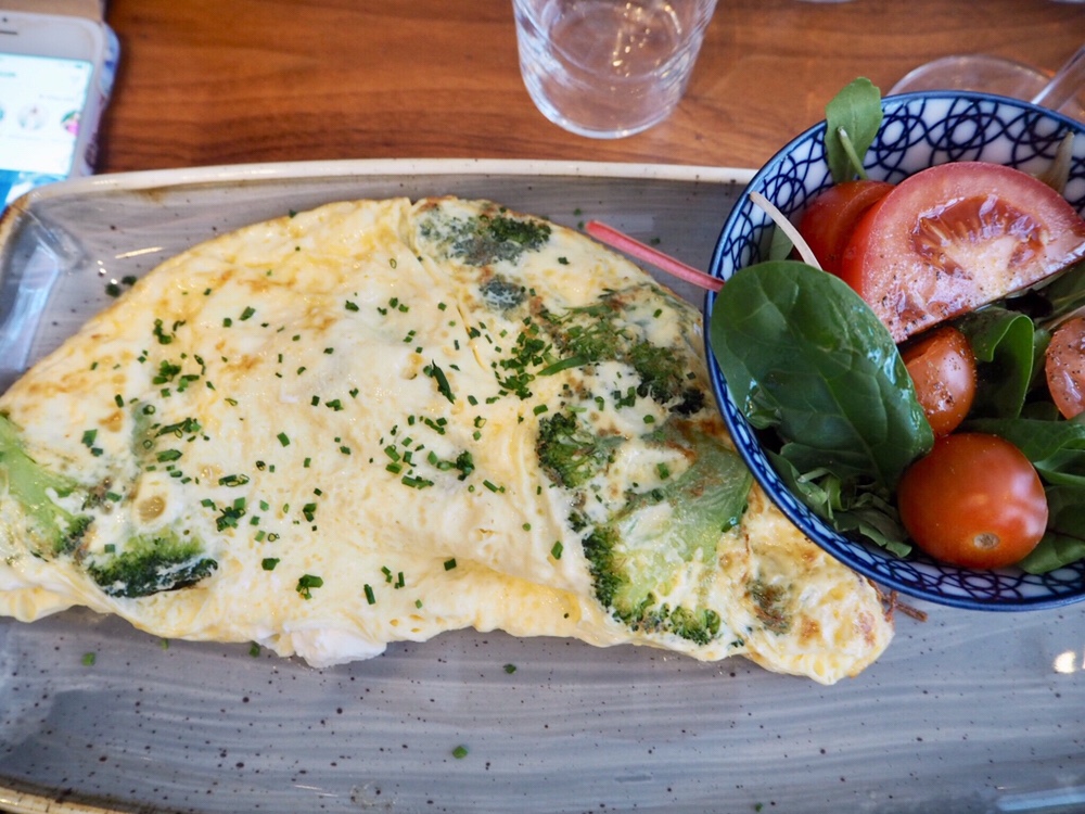 Jag åt en god omelett och Milo fick festa till det med amerikanska pannkakor.