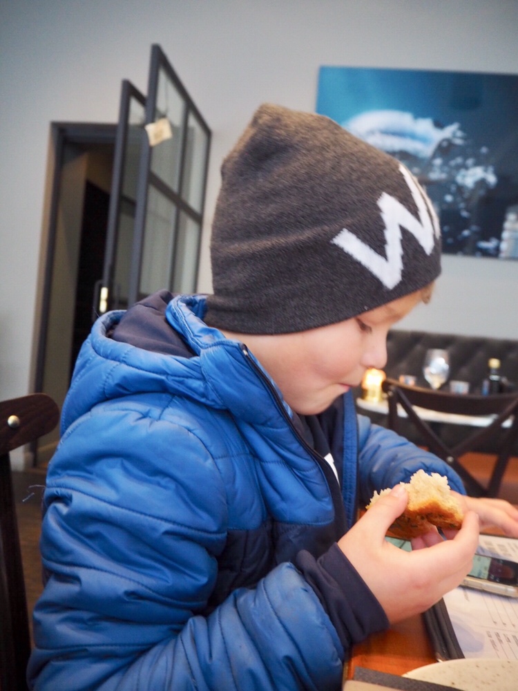 När vi kom fick vi en varsin påse med bröd i. Fröknäcke och mjukt bröd, kändes som focaccia ungefär. Milo smaskade i sig redan innan han fick av sig jackan.