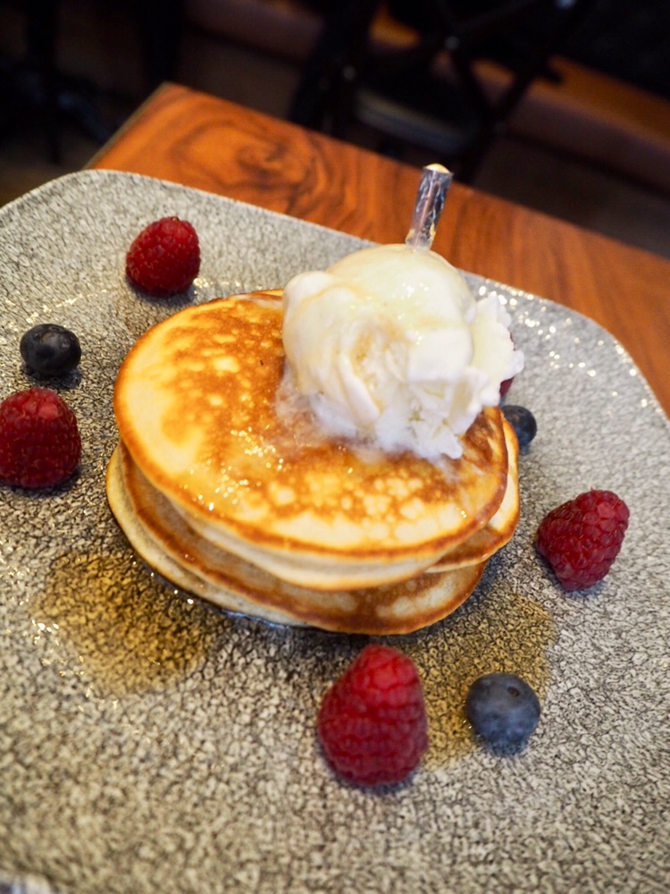 Jag åt en god omelett och Milo fick festa till det med amerikanska pannkakor.