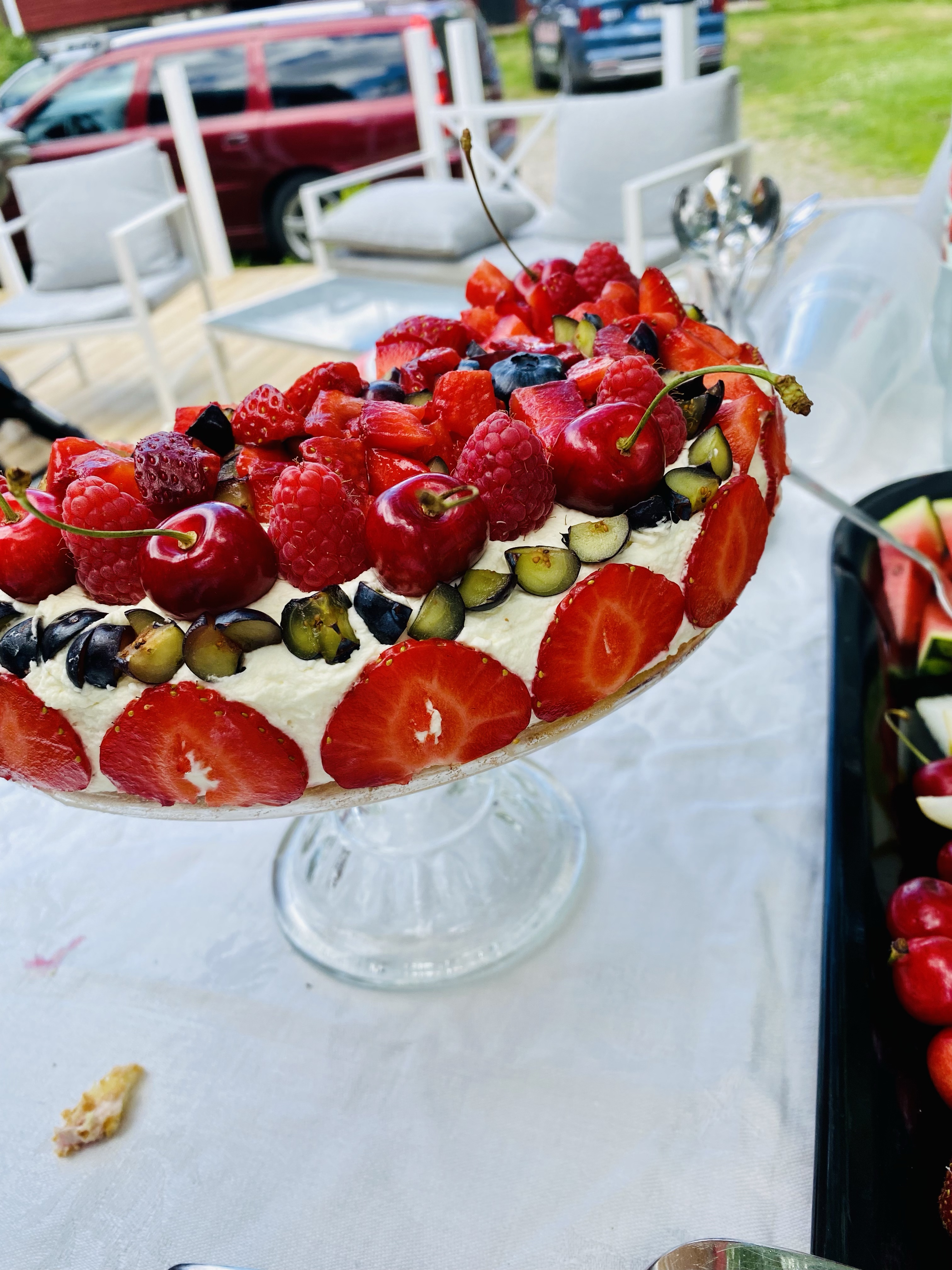 Fintårta, fruktfat och fika i solen hemma i trädgården hos dom. Så mysigt, älskar när vi alla ses. Helst nu när allt är under liiiiite mer normala former.