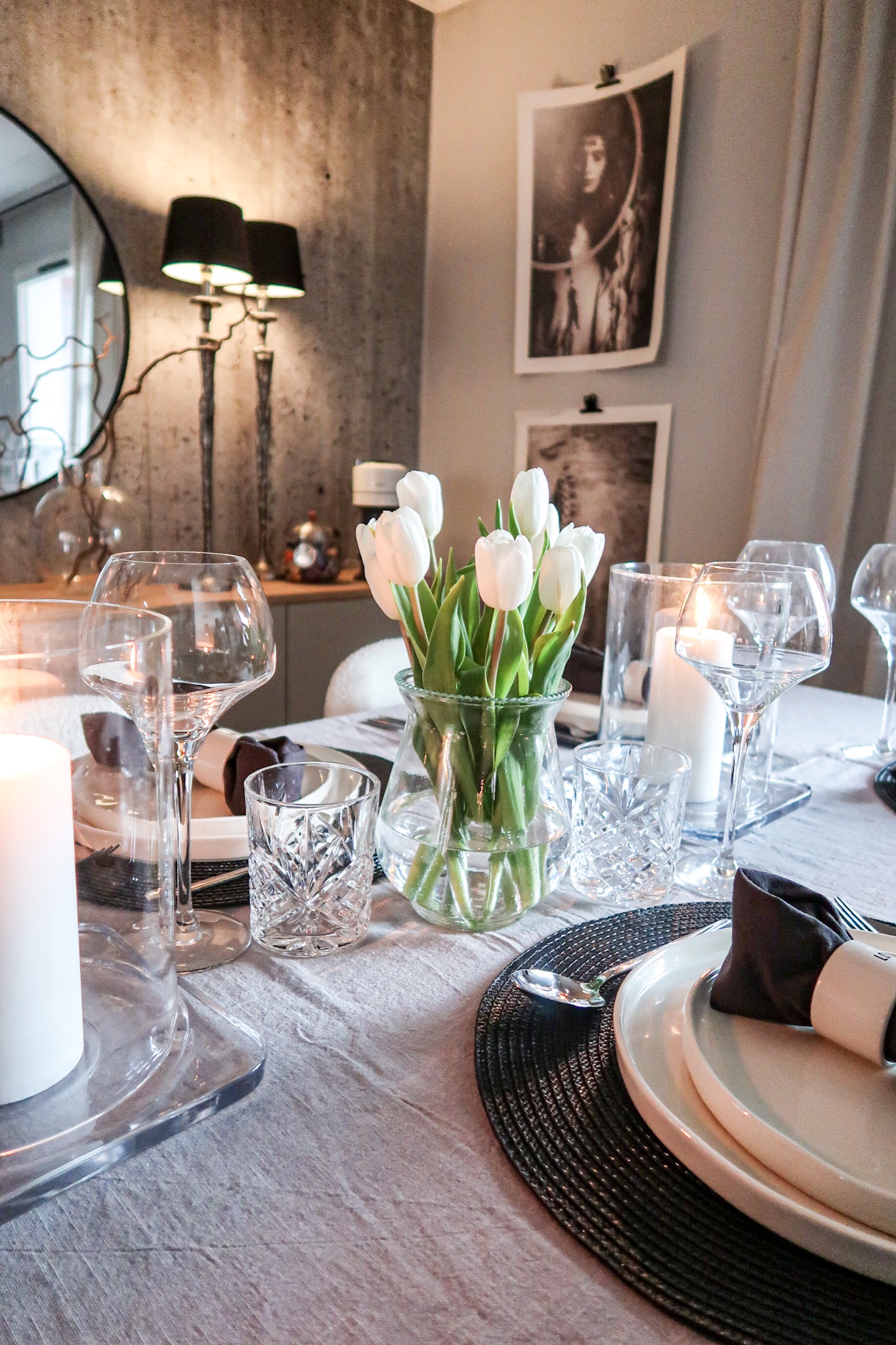 Bestick HÄR (världens bästa pris) // Tallrikar HÄR // Vinglas HÄR (dricker allt ur dessa, skumpa/cola zero/havremjölk) // Dricksglas HÄR (bra pris om man köper 6 st) // Ljuslyktor IKEA // Servetter HÄR // Servettringar H&M Home // Liten vas ICA Maxi