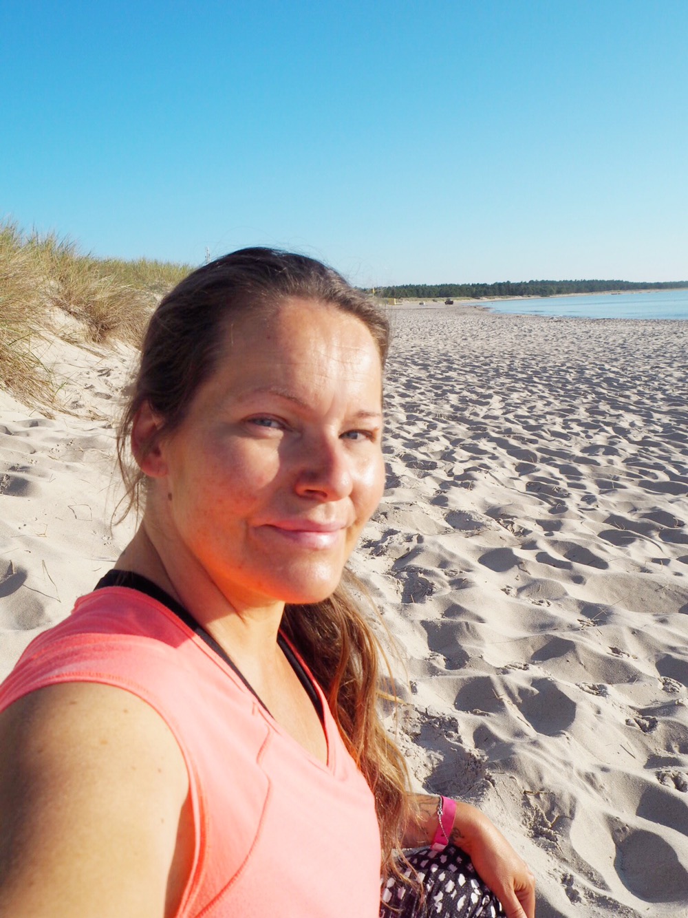 I morse vaknade jag tidigt som tusan. Gick på toa i servicehuset….alltså låt oss prata mer om det. Ibland är jag så glad över att jag vaknar tidigt, då får man sitta alldeles ifred på toa. Ingen som står och stampar utanför eller att man blir stressad av folk som rör sig utanför. I morse var det bara jag och nattradion där på toan. Så jäkla lyxigt! Haha! Ja jag har inte så höga krav jag inte… Efter det så klädde jag på mig träningskläder och gav mig iväg på promenad, stranden lockade med fina solen som just var på väg upp.