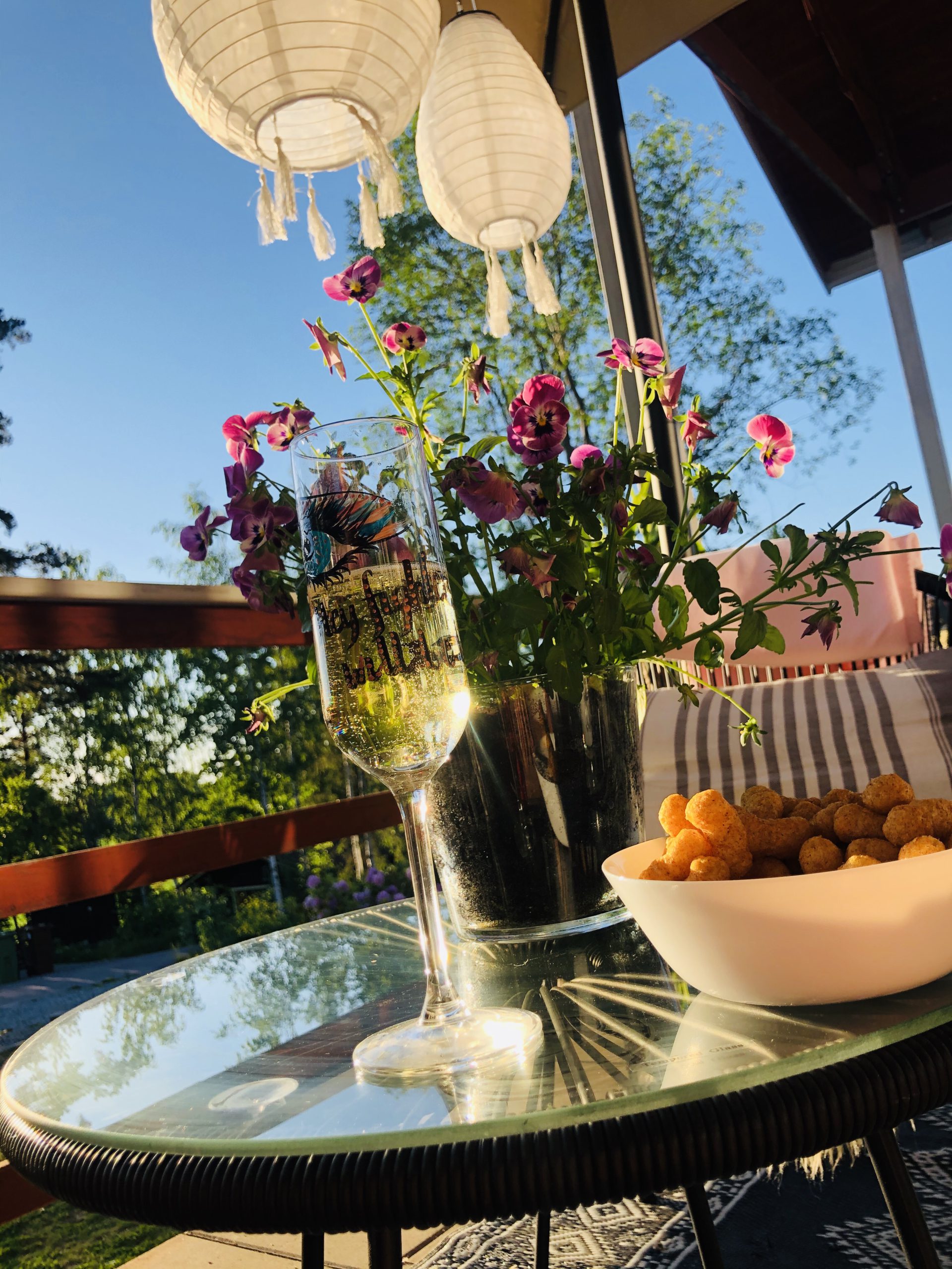 Sen var det hem till vår altan som fullkomligen vadade i kvällssolen. Vi satte oss med ett varsitt glas bubbel och lite snacks och bara njöt av kvällen. Körde en live på >>min Instagram<< också, så kul att få hänga med lite följare och bara snacka om allt möjligt.