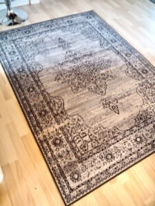 Jäklars vad suddig bilden blev men ville mest visa här vilken matta mamma köpte. Den 149:nde i raden typ. Haha….mattgalna mamma. Tyckte den var riktigt fin. Sedan har hon en liten likadan vid dörren. Fasen, 199 spänn på Rusta. Så billigt!