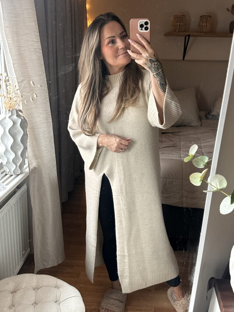 Jag hade på mig min stickade klänning med hög slits….så mjuk att man tror det är myskläder men ändå så fin. Och till det leggings i viskos som sitter helt perfekt.