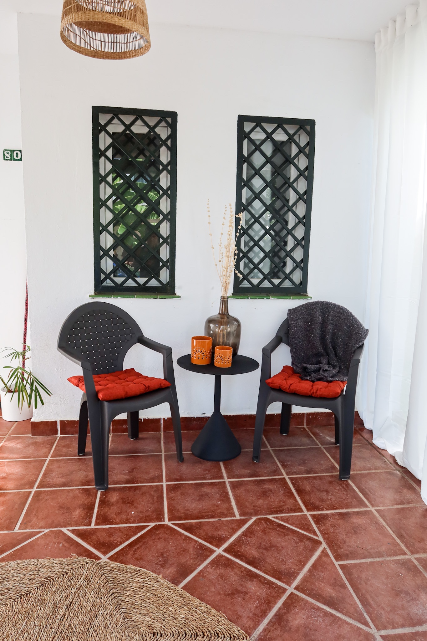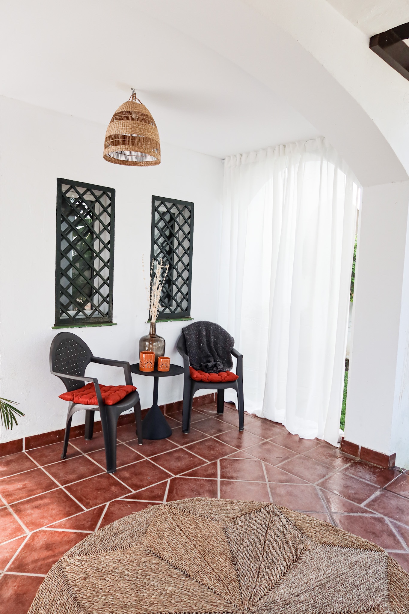 Här har ni vår entré, när vi skrev på kontrakt på den här lägenheten så var det ju en jättemysig entré med lite korgmöbler och sånt. Trodde vi, det visade sig ju inte vara den lägenheten som fanns på bilderna. Detta är en likadan, absolut, men den är spegelvänd och den hade helt andra möbler. Dessutom fanns här ingenting t ex vid entren. Det är massa annat som också saknats som vi nu fått en del av. De har alltså köpt till sånt som vi saknade och faktiskt skrev på för. Första dagarna var ju kaos! Jag ville inte ens flytta in till en början, Tony var fly förbannad. Men, förmedlingen har varit väldigt tillmötesgående med oss. De kom t.o.m. hem till oss för att prata igenom saken. Där lovade de att åtgärda allt sånt som saknades. Sånt som dynor till loungegruppen på takterrassen, köksutrustning, utemöbler på baksidan osv. Dock så fick jag aldrig mina korgmöbler till framsidan, och eftersom vi hyr så kan jag ju kanske inte köpa störa möbler som vi sen inte kan frakta hem. Löser jag det? Tror det ska gå en lastbil som man kan köpa plats i härifrån till Sverige, så kommer jag köpa möbler också. Men så länge så får dessa två plaststolar som hör till utemöblerna på baksidan duga.