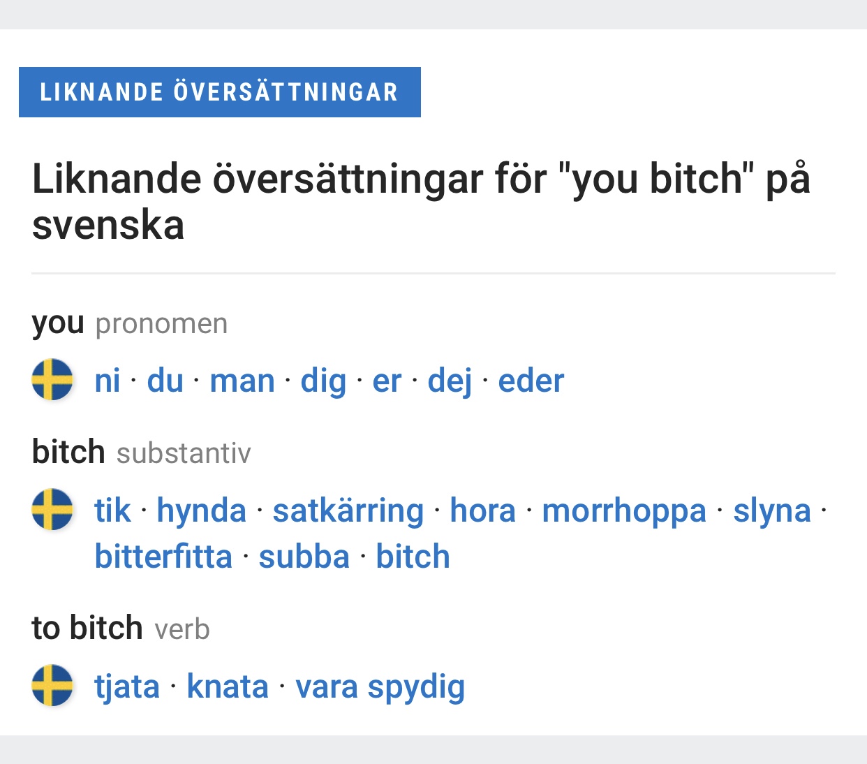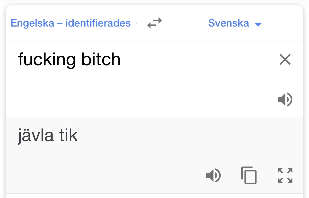 Eeeeh, jävla tik? Say what? Alltså tik som i tjejhund. Det låter ju för fasen inte klokt. Men skriver man ”You bitch” så står det såhär: