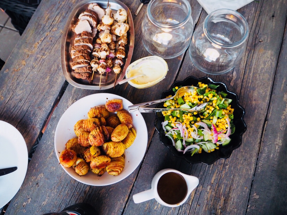 Igår blev det grillad fläskfile, hasselbackspotatis, halloumi, 2 såser och sallad. Jag åt ett laxpaket istället för kött då jag inte äter det så mycket längre.