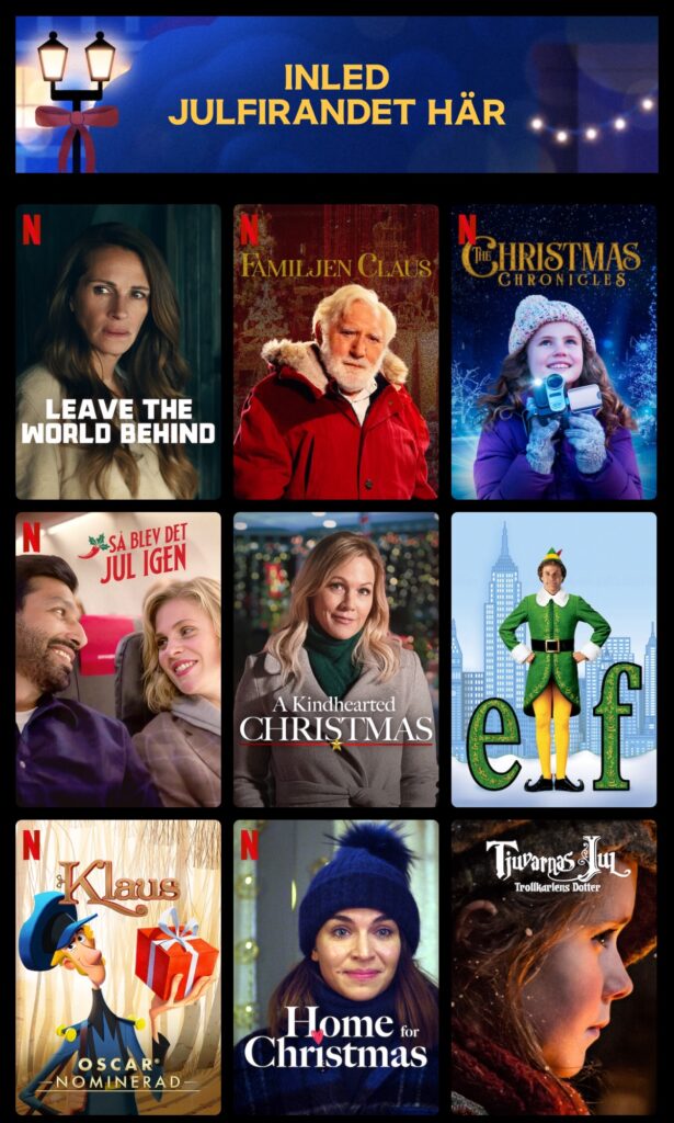 Netflix har full koll när det kommer till julfilmer. Om jag får tipsa om några så är ”Holiday” ett stående inslag varje jul. Äääääälskar den filmen! ”Tomten är far till alla barnen” är också tradition. Missa inte ”The Christmas cronicles.” Och ”Harry Potter” är väl ett självklart val.