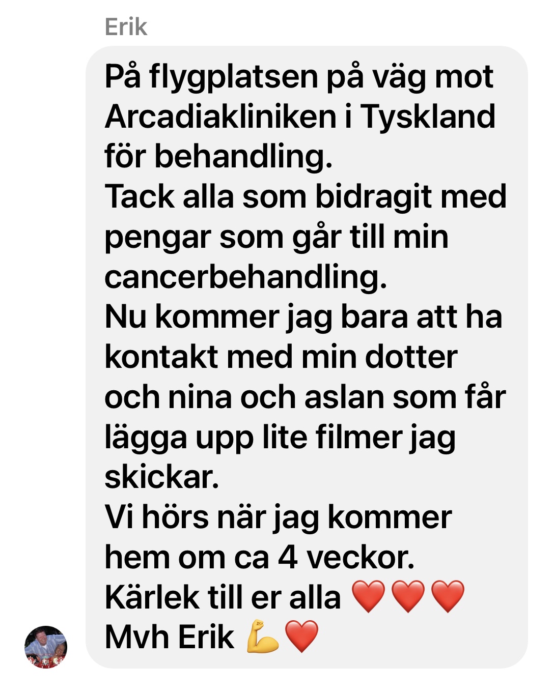 Det ska bli så spännande att följa Eriks resa och behandling i Tyskland. Jag känner mig så oerhört trygg i att det är just där han är. En av mina bästa vänner har blivit behandlad på samma klinik ju och är ju idag helt cancerfri. Hon är inte ensam, det är många som blivit hjälpta på denna fantastiska klinik. Om du vill hjälpa Erik för eventuellt fler behandlingar så kan du swisha honom på 0723-191219.