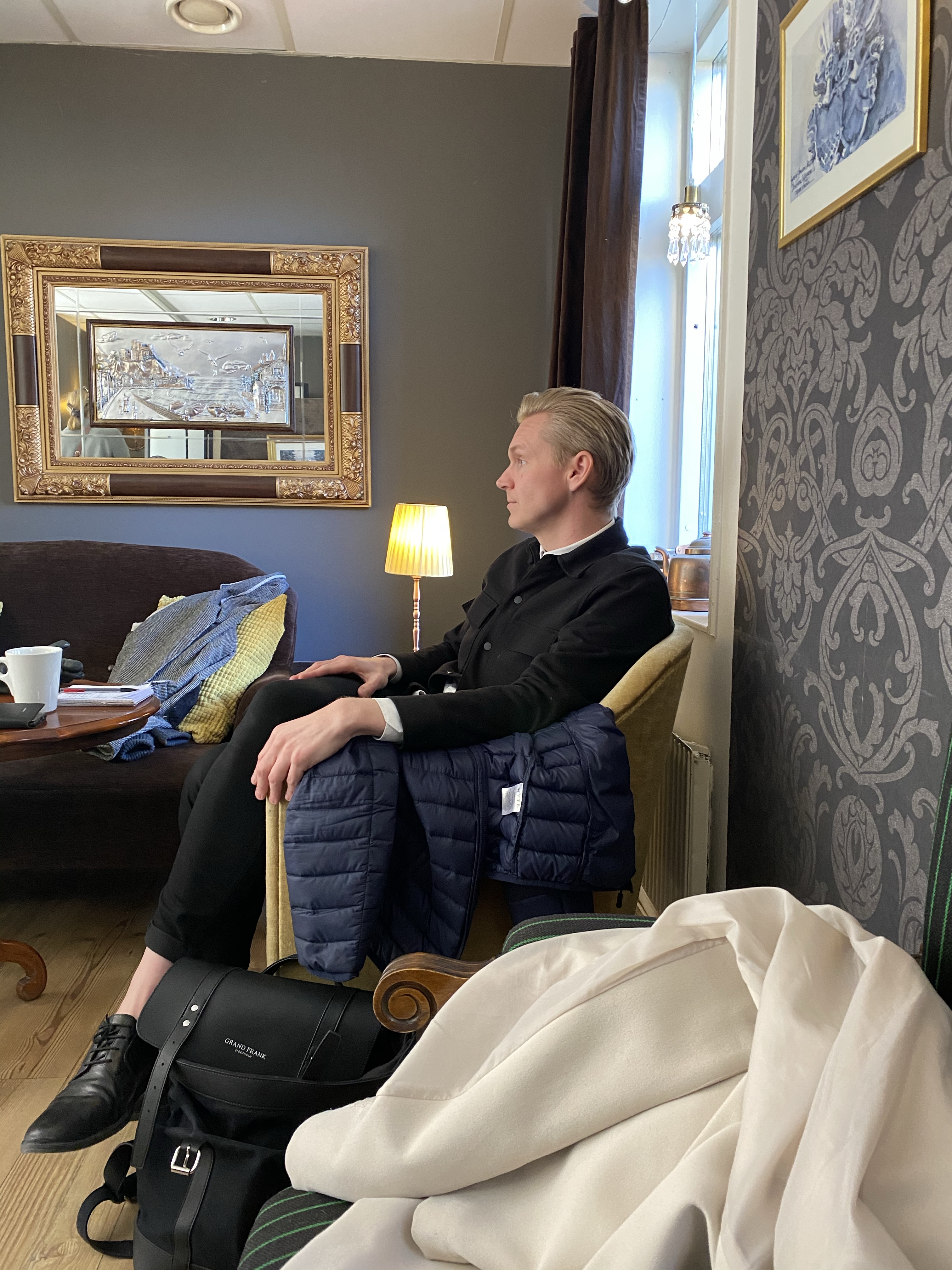 Här satt vi med Ena Håbo tidningen på Systrar 2 här i stan. Eriks cellgiftspåse är kopplad in i en shunt i hans hals, påsen ligger på magen och så fylls det på i 48 timmar. Han är svag i immunförsvaret så det var bra att de ordnat med utrymme och att vi fick sitta med avstånd och ensamma i rummet.