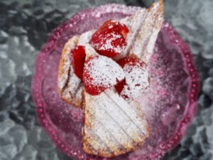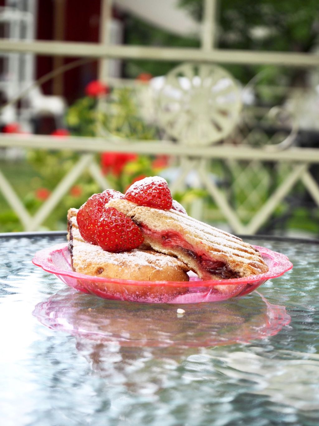 5) Pudra på florsocker uppepå och lägg några klyftas jordgubbar utanpå.