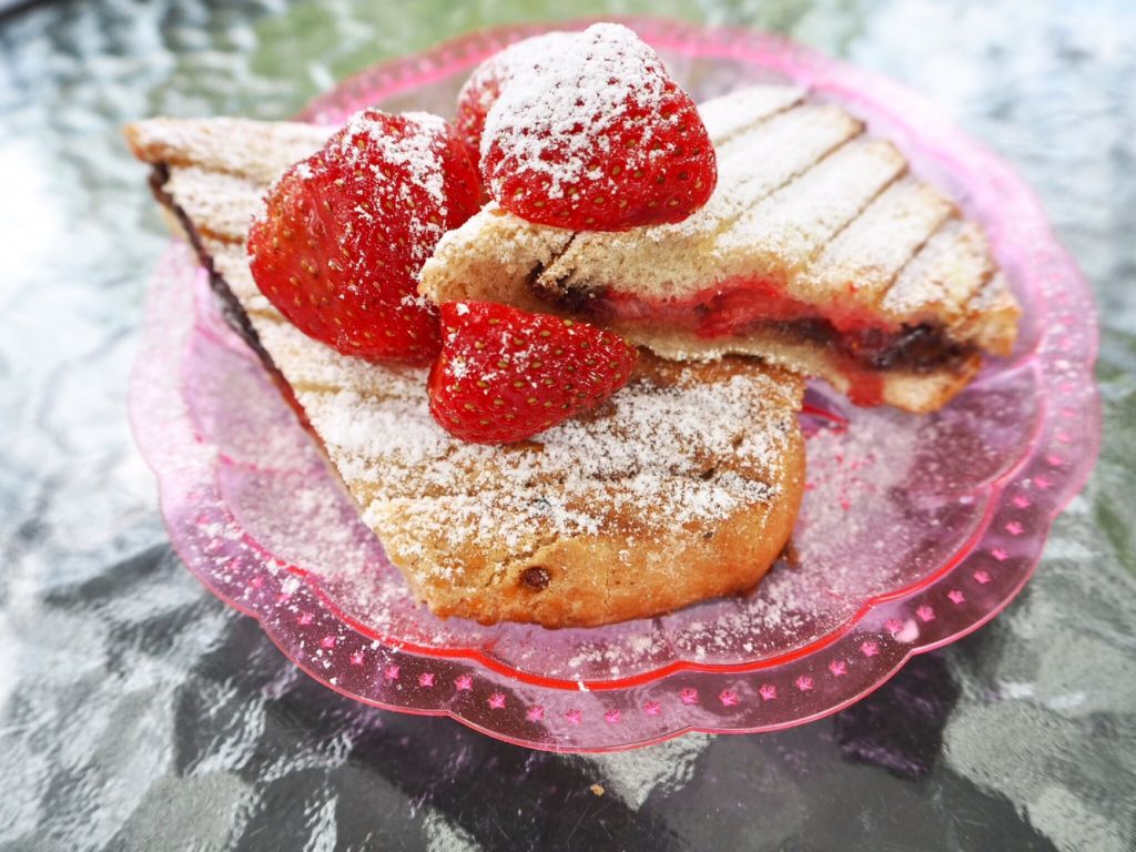 Detta är en panini med en härlig fyllning av färska jordgubbar och Nutella. En riktig höjdare. Brödet är ett lantbröd, mitt recept på lantbröd (busenkelt) hittar du här.