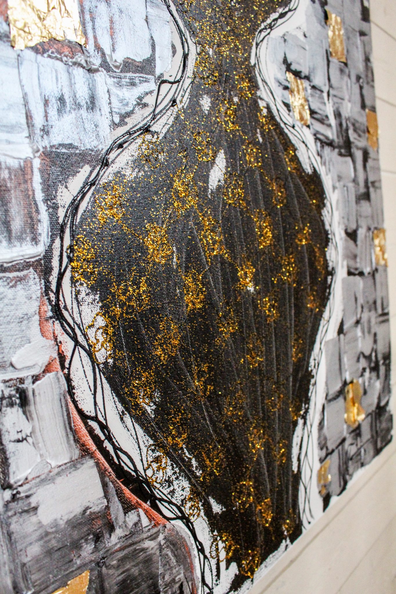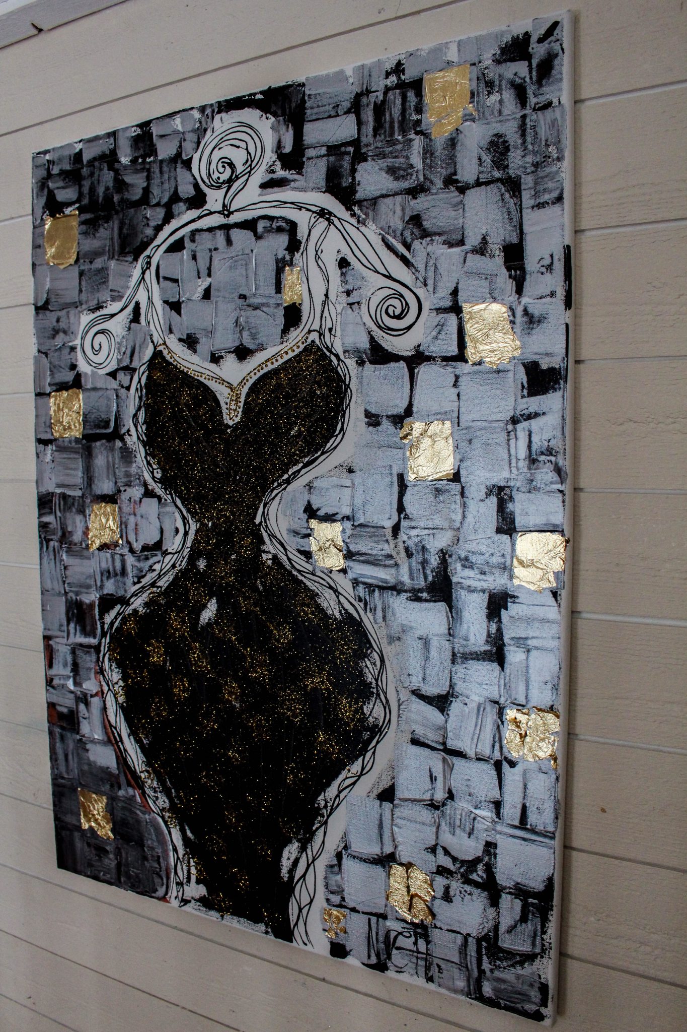 När jag målar så har jag ju först haft en liten tanke men vad jag ska göra. Den här hade jag inte så mycket tanke med utan jag satte bara igång. Det roliga är att jag på något sätt aldrig är i nutid. När jag målar klänningar så är jag långt tillbaka i tiden. Här kändes det som man var i en rökig bar i New York någonstans mellan 20 och 40 talet. Långa cigaretthållare, långa handskar, runda höfter och röda läppar. Det guldiga i bak är väggarna i baren – exklusivt och pampigt. Skillnaden är nog bara att kvinnosynen i mina målningar har en helt annan historia.